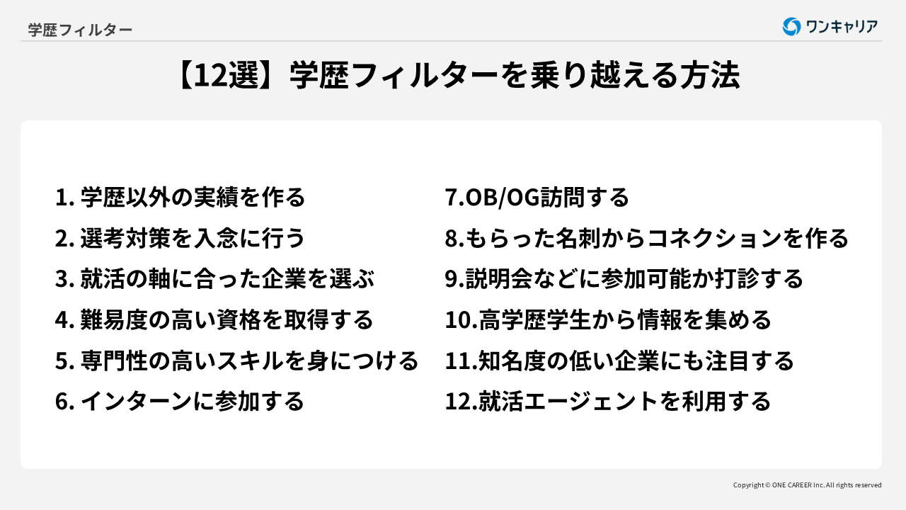 学歴フィルターを乗り越える方法まとめ ・学歴以外の実績を作る ・選考対策を入念に行う ・就活の軸を明確にし、それに合った企業を選ぶ ・難易度の高い資格を取得する ・専門性の高いスキルを身につける ・インターンに参加する ・OB・OG訪問する ・企業のイベントでもらった名刺から芋づる式にコネクションを作る ・説明会などに参加可能か、企業へ直接打診してみる ・高学歴大学の学生から、企業の採用・選考情報を集める ・知名度の低い企業にも注目する ・就活エージェントを利用する