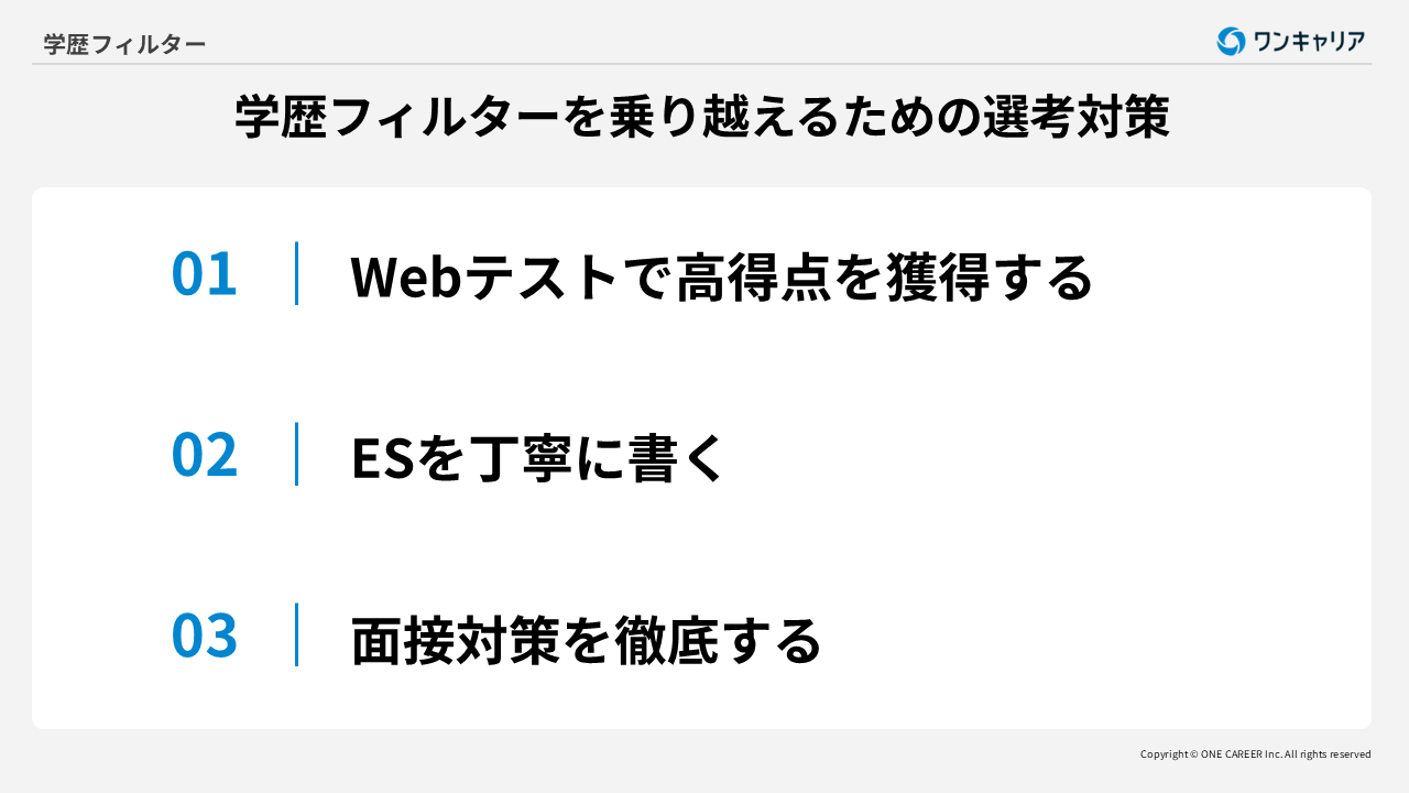 重要なことは、学歴フィルターを批判することではなく、「学歴フィルターを理解した上で、どう戦略的に就活を進めるか」です。