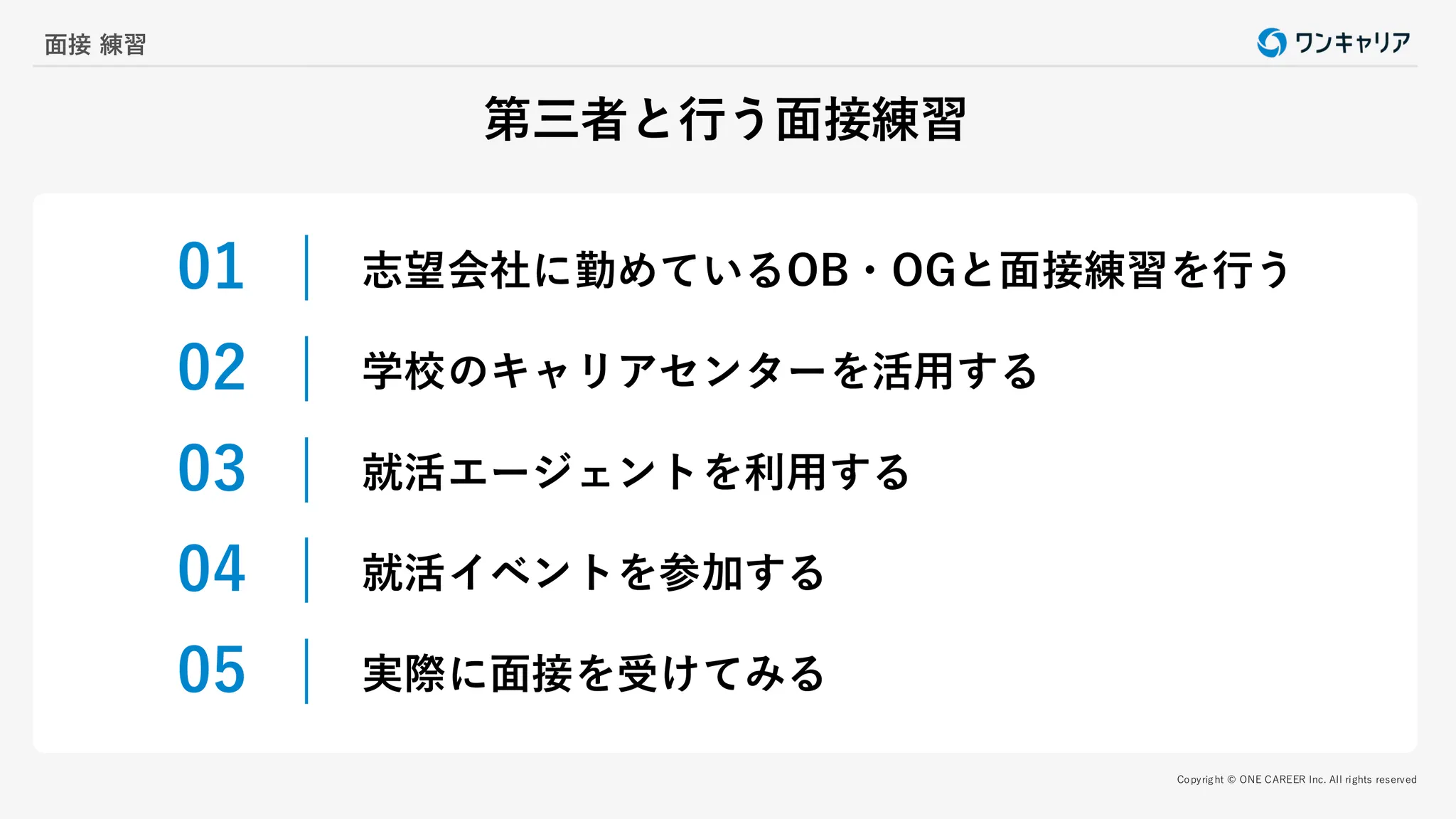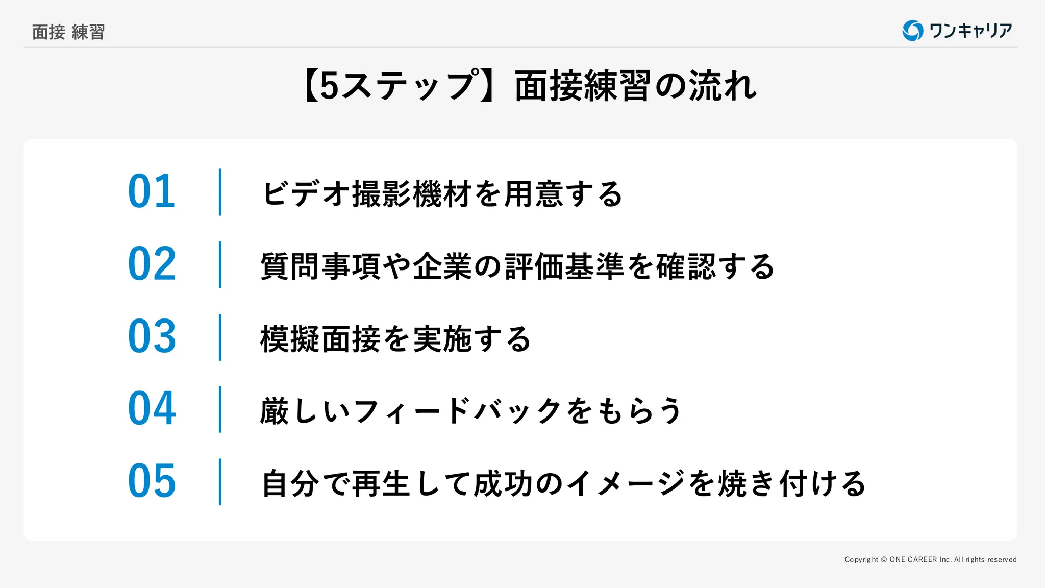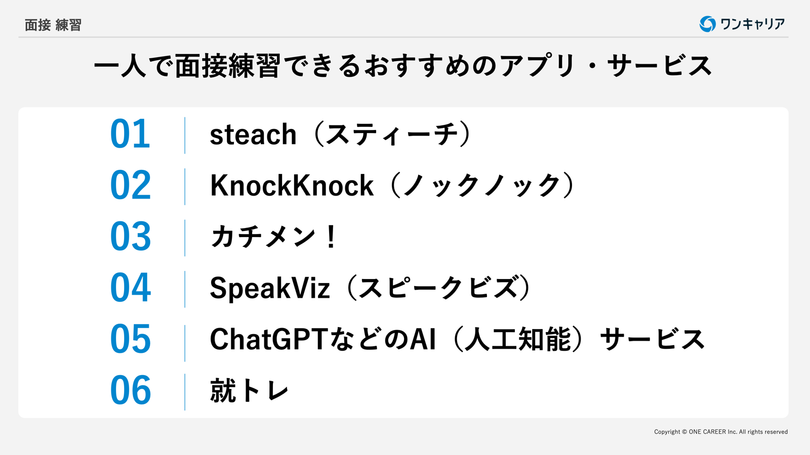 <目次> ●就活において面接練習が重要な理由 ・本番で落ち着いて回答するため ・スムーズに受け答えするため ・伝えやすい話し方ができるようになるため ・回答する内容を整理するため ・自分の弱点を把握するため ●面接練習を特にやっておいた方がいい人は? ・緊張しやすく真面目な人 ・面接経験が少ない人 ・面接の結果がうまくいかない人 ●面接の流れについて ・対面面接の流れ ・Web面接の流れ ●第三者と面接練習をする方法 ・志望会社に勤めているOB・OGと面接練習を行う ・学校のキャリアセンターを活用する ・就活エージェントを利用する ・就活イベントに参加する ・実際に面接を受けてみる ●【5ステップ】第三者と面接練習する流れ ・【ステップ1】ビデオ撮影機材を用意する ・【ステップ2】質問事項や企業の評価基準を確認する ・【ステップ3】模擬面接を実施する ・【ステップ4】厳しいフィードバックをもらう ・【ステップ5】自分で再生して成功イメージを焼き付ける ●【3ステップ】 一人で面接練習する流れ ・【ステップ1】質問を想定する ・【ステップ2】回答をメモする ・【ステップ3】声を出して回答する ●一人で面接練習できるおすすめのアプリ・サービス ・steach(スティーチ) ・KnockKnock(ノックノック) ・カチメン! ・SpeakViz(スピークビズ) ・ChatGPTなどのAI(人工知能)サービス ・就トレ ●面接練習のチェックポイント ・面接マナー ・回答時間 ・回答内容が質問の意図に沿っているか ●【質問別】面接でよく聞かれる質問・回答例一覧 ・アイスブレイク ・自己紹介 ・学生時代に力を入れたこと(ガクチカ) ・就活の軸 ・志望動機 ・自己PR・強み・長所 ・弱み・短所 ・挫折経験 ・キャリアプラン ・他社の選考状況 ・勤務条件 ・時事問題 ・逆質問 ・動物に例えると? などの奇問 ・キラー質問 ●【業界別】面接でよく聞かれること・質問と回答例一覧 ・メーカー ・総合商社 ・投資銀行 ・金融 ・サービス・インフラ ・広告・出版・マスコミ ・ソフトウエア・通信 ・公官庁・公社・団体 ●面接練習する際の注意点 ・本番と同じように臨む ・入室・退室も含めて練習する ・改善点を踏まえて練習を繰り返す ・回答内容を丸暗記しない ・アピールポイントはエピソード交えて具体的に伝える ・練習通りにならないケースも想定する ・質問は深掘りしてもらう ●面接の質問への答え方のポイント4選 ・面接官の質問の意図を理解する ・結論ファーストで端的に伝える ・客観的事実や数値を用いる ・目を見てハキハキと話す ●面接練習に関するよくある質問 ・面接官に緊張していることを伝えてもいいですか? ・面接練習を家族に依頼してもいいですか? ・面接練習は何日前から始めればいいですか? ・一人で面接練習をする方法を教えてください ●まとめ