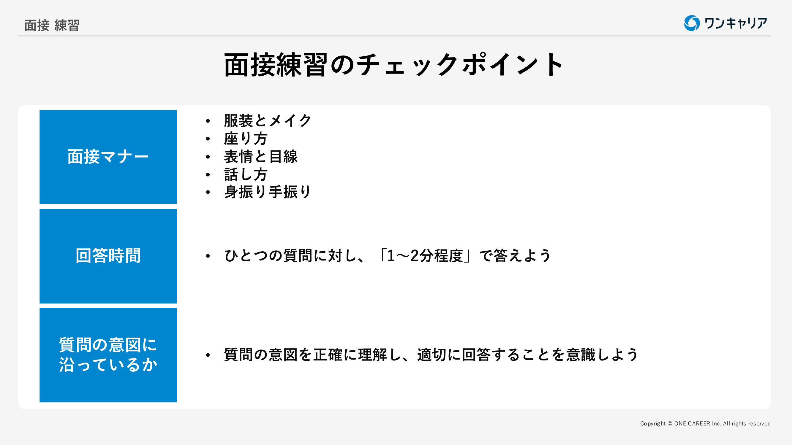 以下のポイントを意識して面接練習を行うと、スムーズな受け答えが身に付くでしょう。