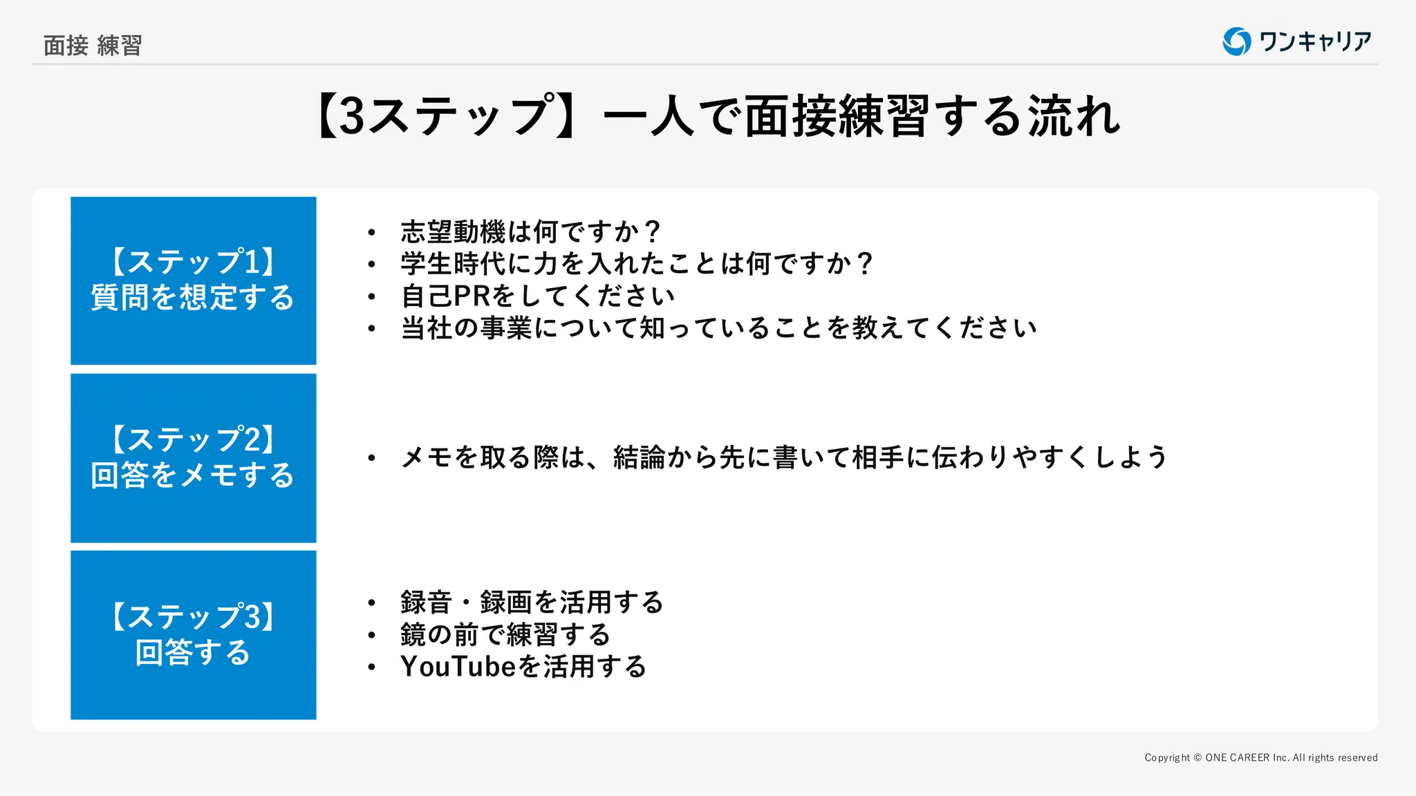 一人で面接練習をする場合の流れは以下の3つのプロセスを意識しましょう。