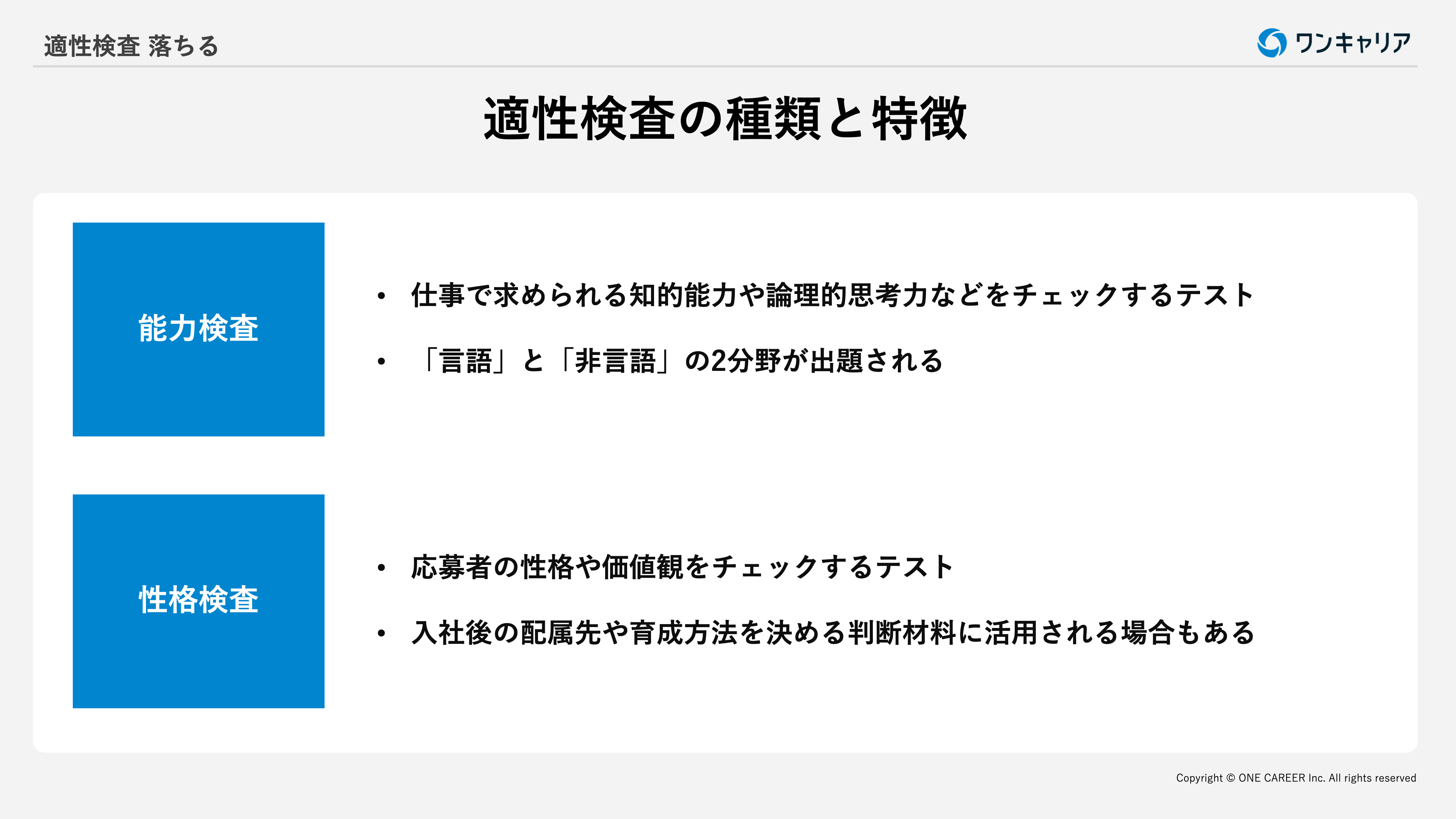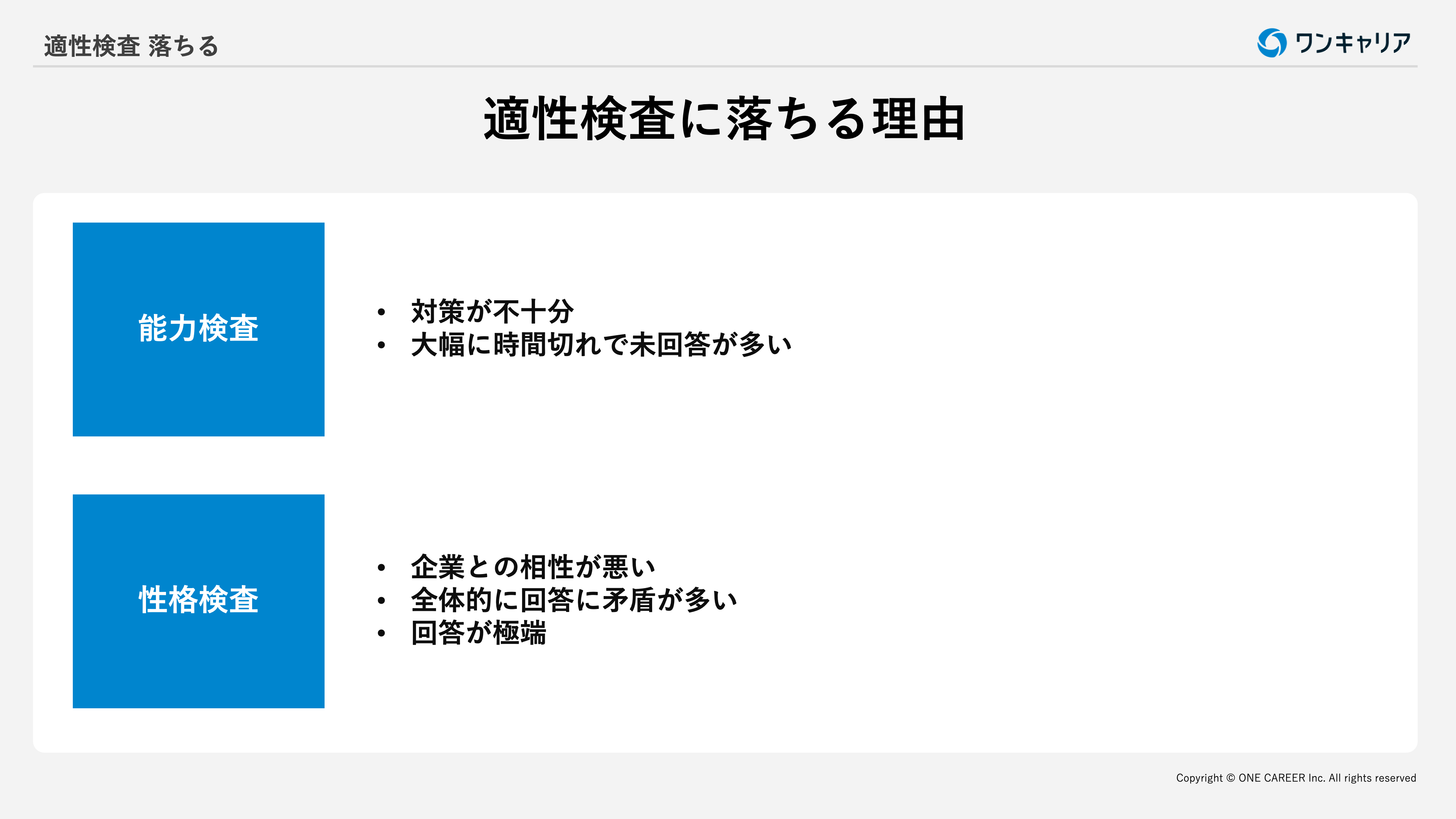 「能力検査で落ちる理由」「性格検査で落ちる理由」のそれぞれで解説します。