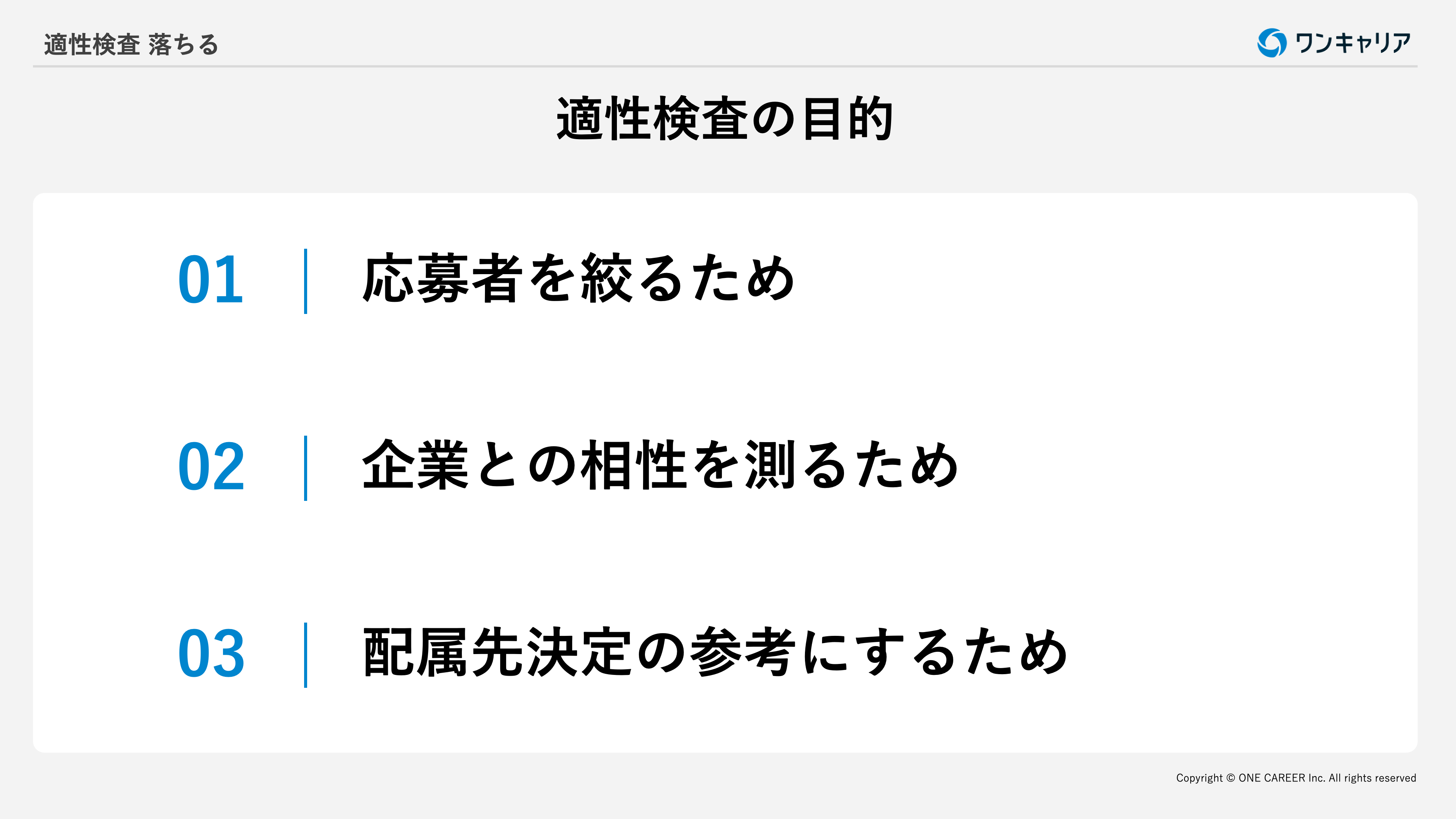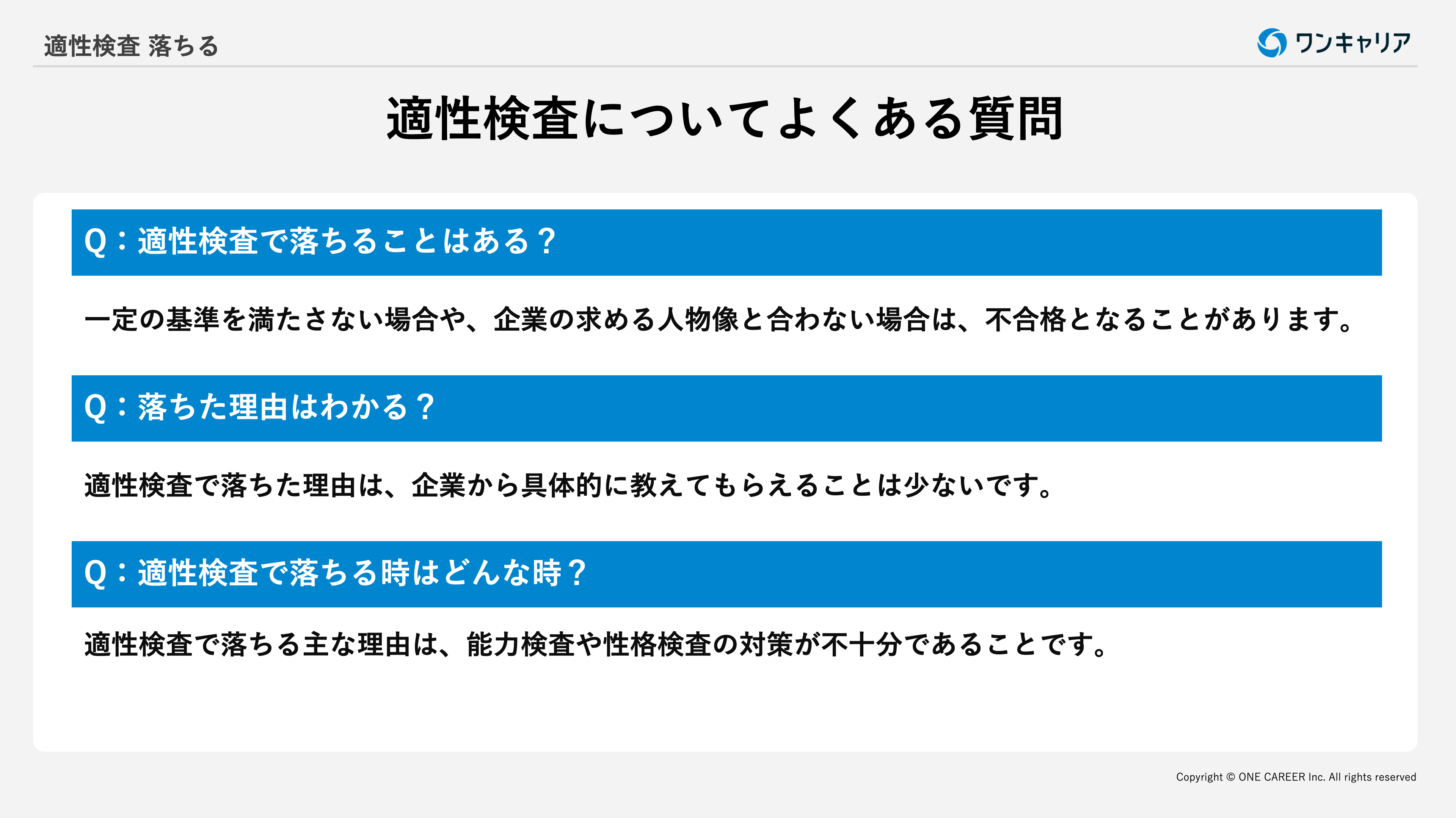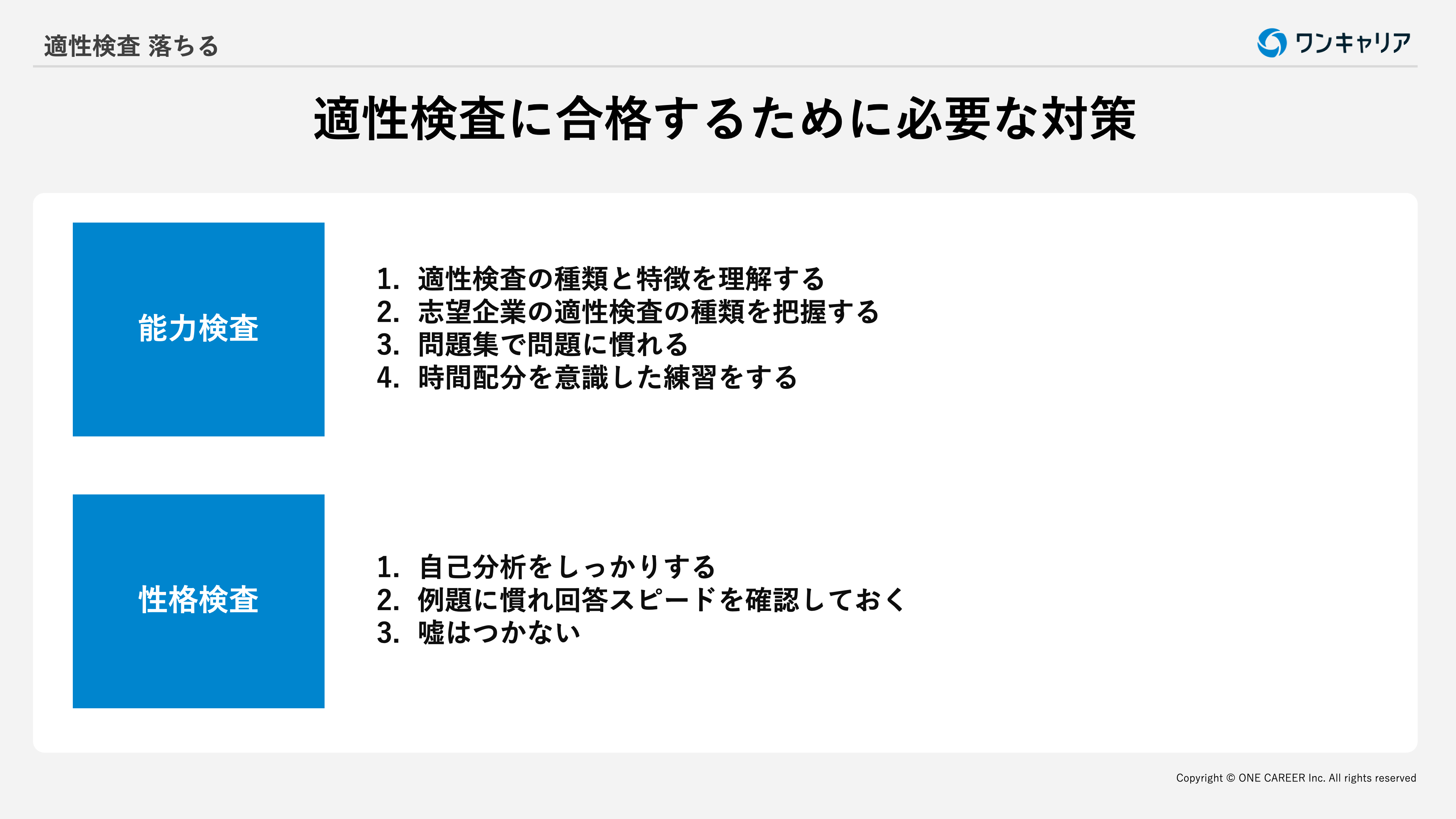 ・適性検査とは └能力検査と性格検査の特徴。 ・適性検査の目的 └就活生を絞る、企業との相性を測る、配属先決定の参考にするため。 ・適性検査に落ちる確率 └適性検査に落ちる割合は、20~30%程度。適性検査の難易度にもばらつきがある。 ・適性検査に落ちる確率 └能力検査と性格検査によって異なる。 ・能力検査の対策 1. 適性検査の種類と特徴を把握する 2. 志望企業の適性検査の種類を把握する 3. 問題集で問題に慣れる 4. 時間配分を意識した練習を行う ・性格検査の対策 1. 自己分析 2. 例題に慣れる 3. 嘘はつかない ・適性検査に落ちた場合の対処 └落ちた原因を分析し復習し、気持ちを切り替えて他企業の選考に専念する。