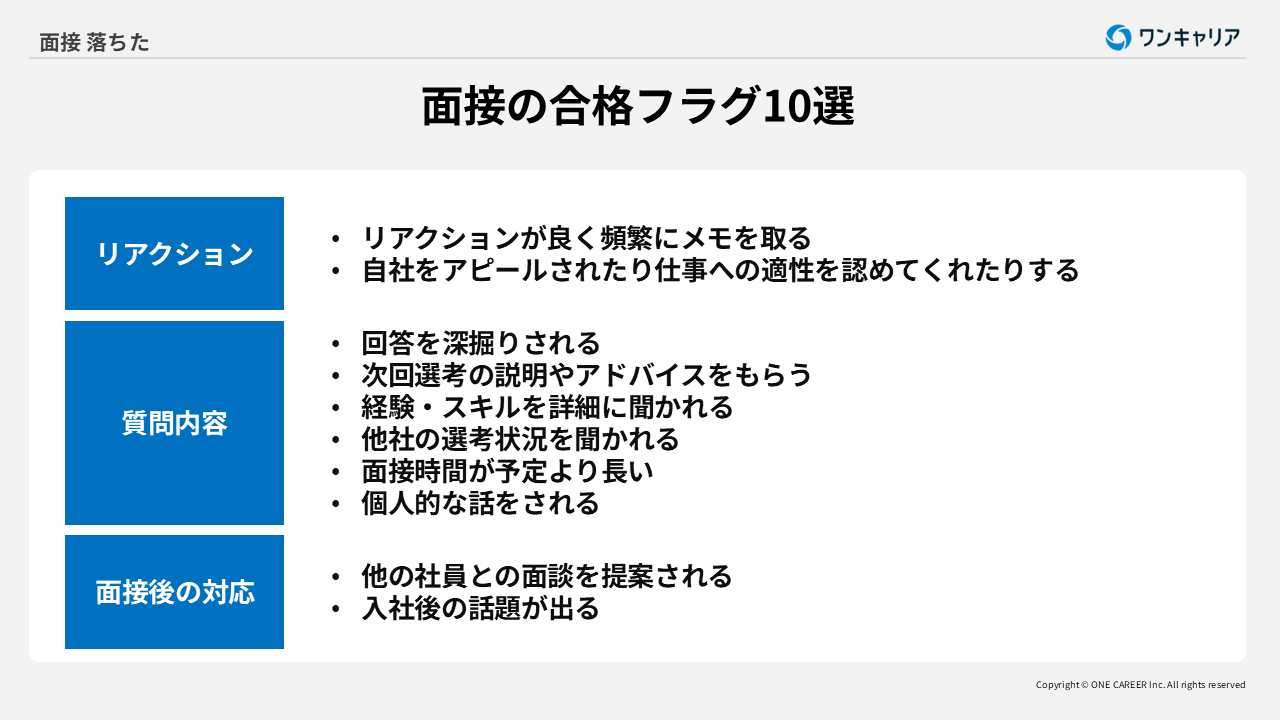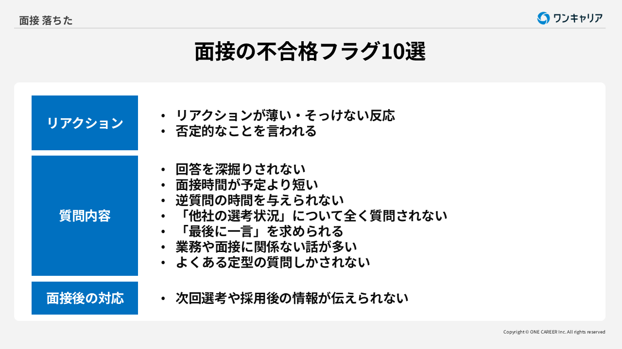 ・選考フェーズ別の面接に落ちる理由 1. 一次面接 └社会人として基礎的なビジネスマナーが身についていなかったり、質問に対しての回答が的外れだったりする場合。 2. 二次面接 └自己PRや志望動機などよく聞かれる質問に対する回答の質が悪かったり、会社側に求められるスキル・経験の基準に満たなかったりする場合。 3. 最終面接 └企業理解が不十分で、会社との相性が悪いと判断された場合。 ・面接の不合格フラグ └面接中の面接官の反応や質問内容、面接後の対応から不合格フラグになり得る10個の判断基準をご紹介。 ・面接の不合格フラグに間違われやすい行動 └エレオクや交通費に関する問題など、よく不合格フラグと勘違いされる行動の真意について詳しく解説。 ・面接の合格フラグ └面接中の面接官の反応や質問内容、面接後の対応から合格フラグと考えられる10個の判断基準をご紹介。 ・面接中に不合格フラグに気づいた時の対処法 └最後まで諦めず面接に集中し、面接後は悩まずに別企業の選考対策に気持ちを切り替える。 ・面接で落とされないための対策 a. 自己分析の徹底 b. キャリアビジョンの明確化 c. ワンキャリアを使って選考対策準備 d. 企業理解と個別特異性の具体化 e. ビジネスマナーの習得 f. 面接練習
