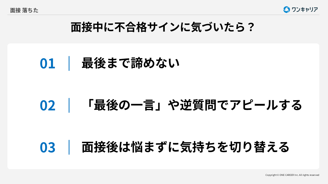 面接官が不合格サインを出した場合でも、これらの工夫を通じて印象を改善し、合格の可能性を引き上げられます。最後まで諦めずに自分をアピールし、面接官に自分の強みや意欲をしっかりと伝えることが大切です。