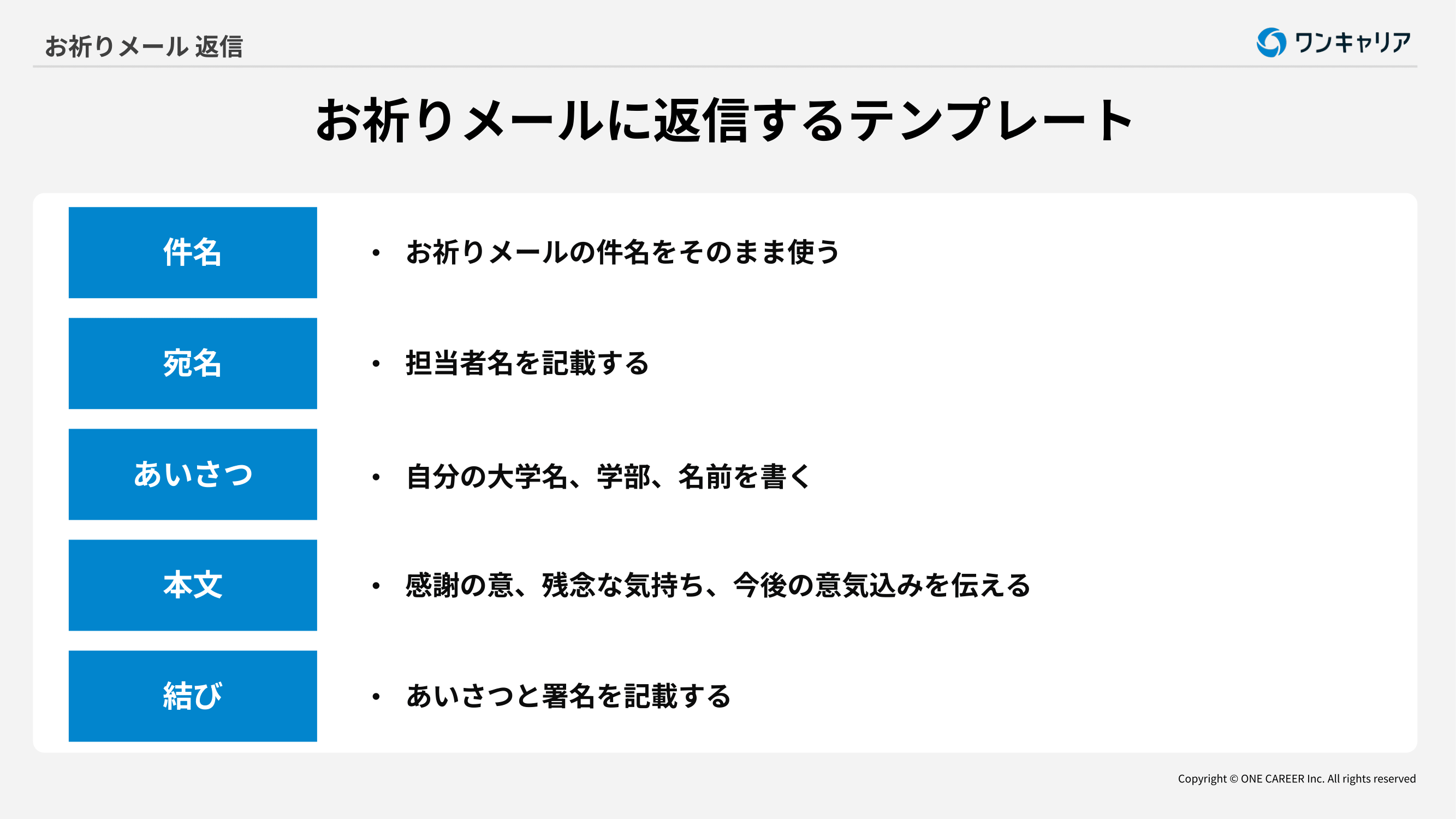 ここでは、件名、担当者名の記載方法や適切なあいさつ文、感謝の意や将来の意気込みを伝える文章まで、お祈りメールに対する適切な返信をするための一連のテンプレートをご紹介します。