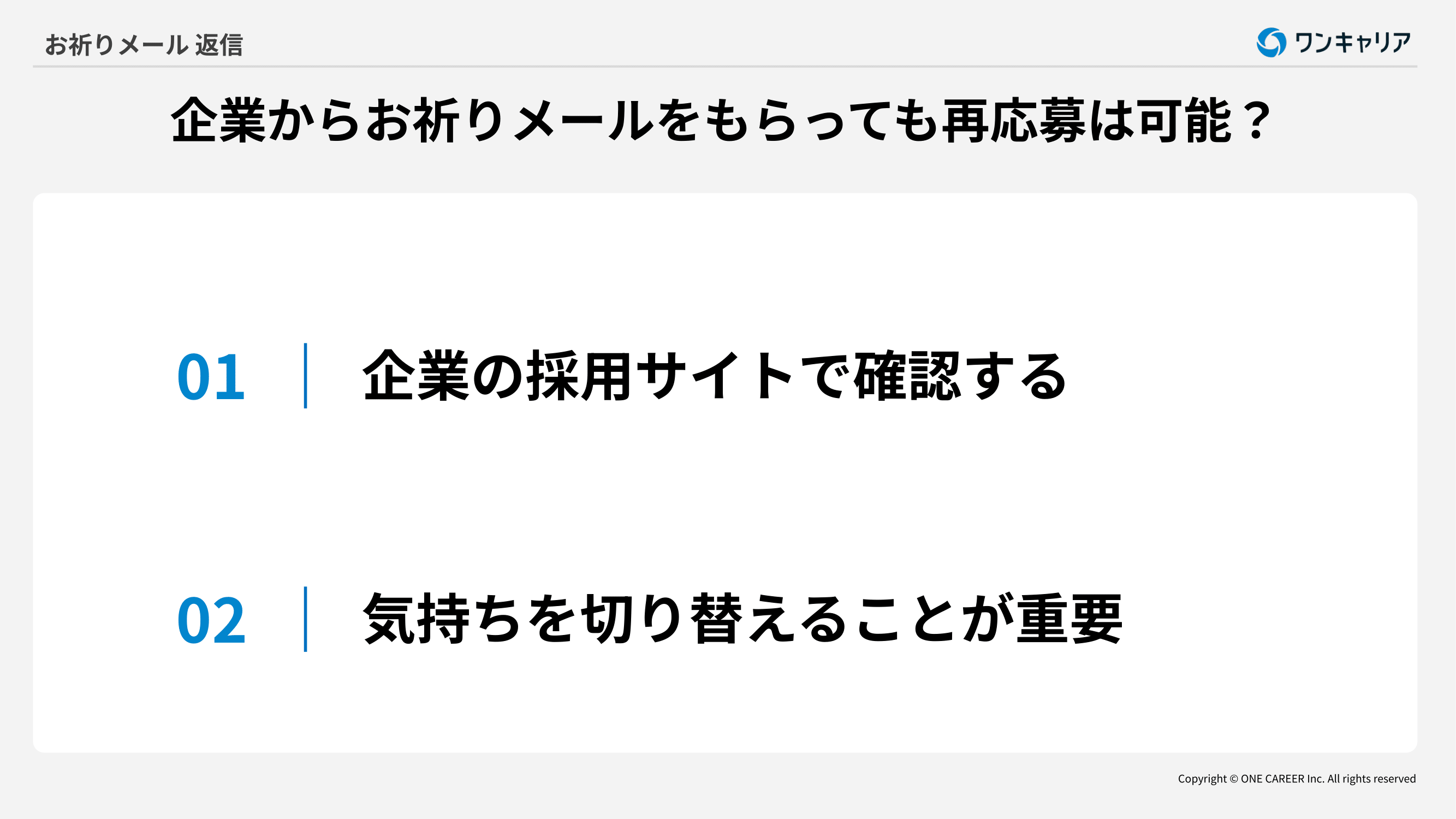 お祈りメールを受け取って落ち込んでしまうのは自然なことですが、「ダメなら次へ」という気持ちの切り替えが重要です。また、メールを送っても返信が来るとは限らないうえ、多くの企業は返信をしない方針を取っています。期待を抱かず、次のステップに進むことが精神的な安定を保つために大切です。