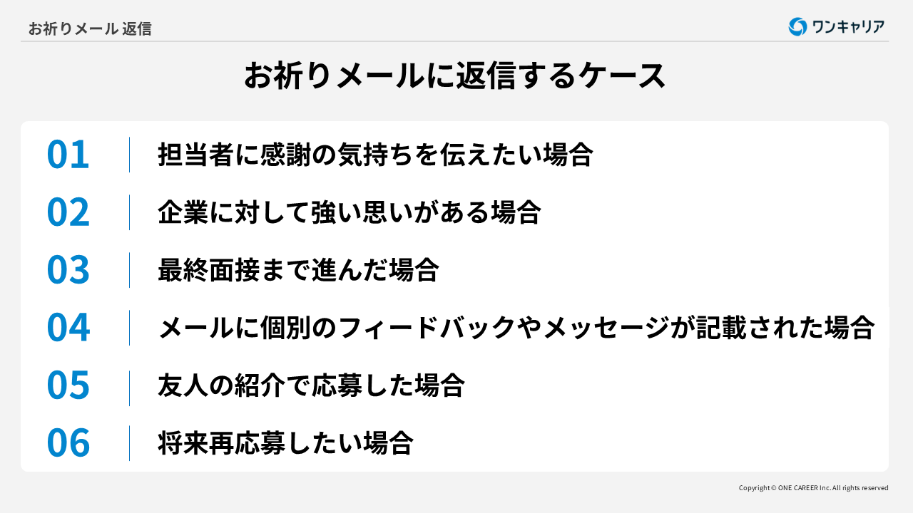 本記事では、担当者に感謝の気持ちを伝えたい場合や、企業に対して強い思いがある場合、最終面接まで進んだ場合、メールに個別のフィードバックやメッセージが記載された場合、友人の紹介で応募した場合、将来再応募したい場合の6つのケースを解説し、各ケースの返信メール例を紹介しました。