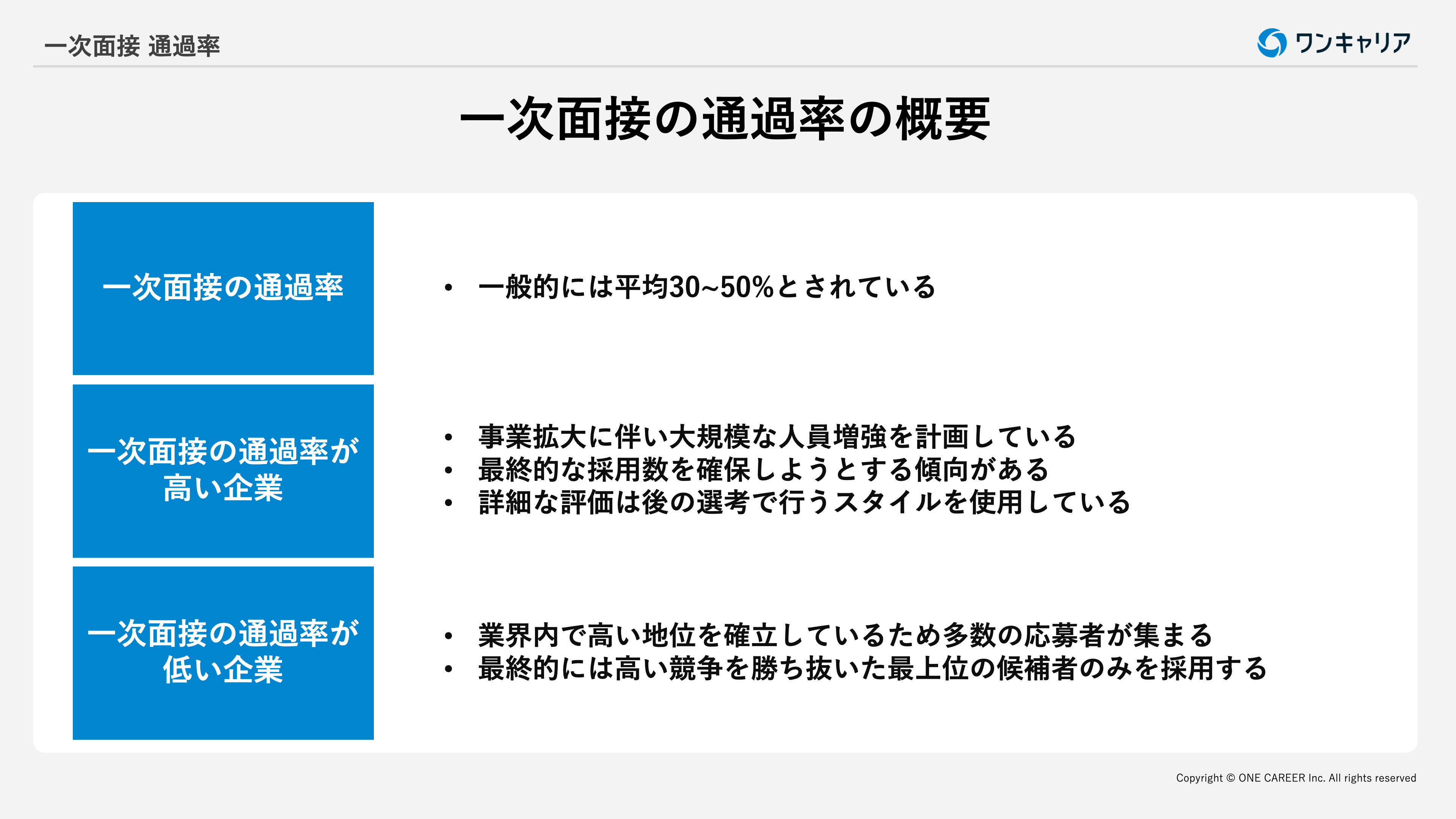 ・一次面接の通過率は平均30〜50%