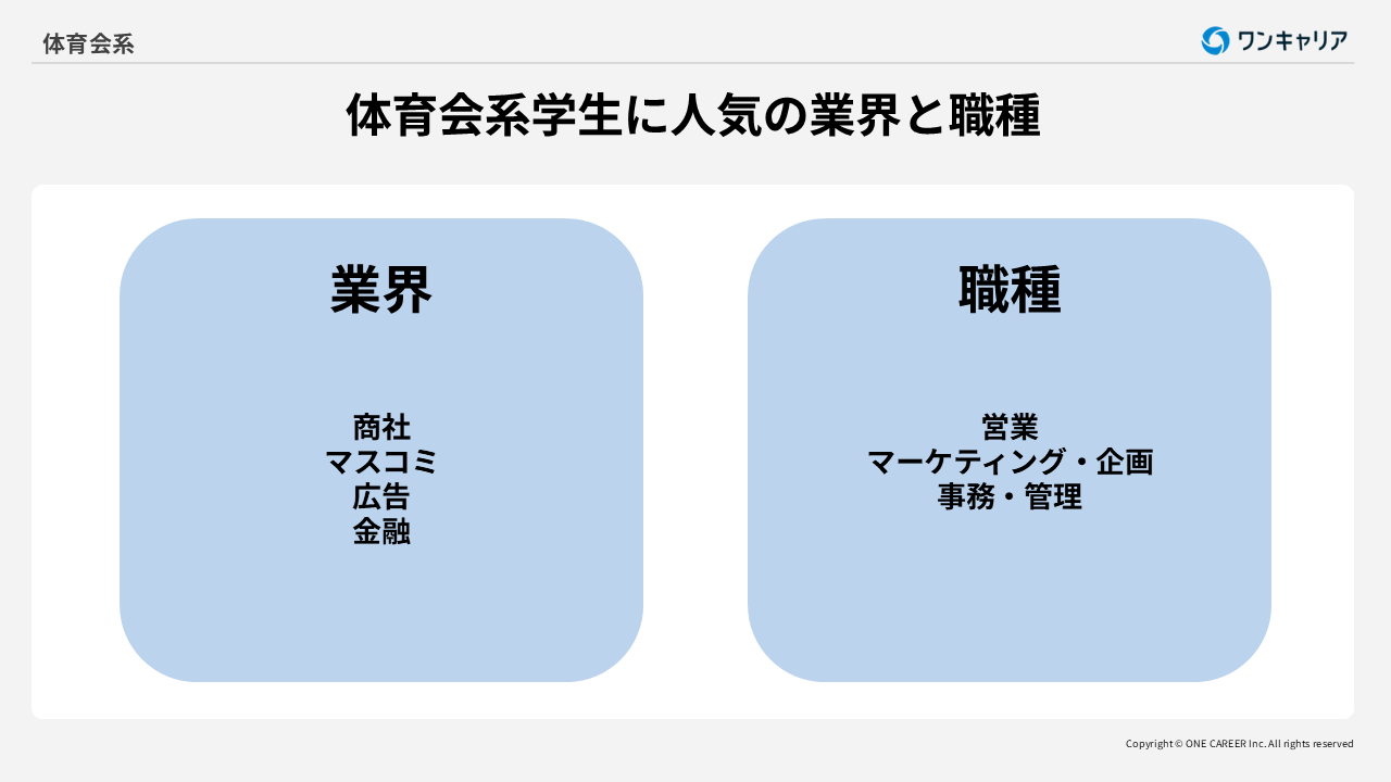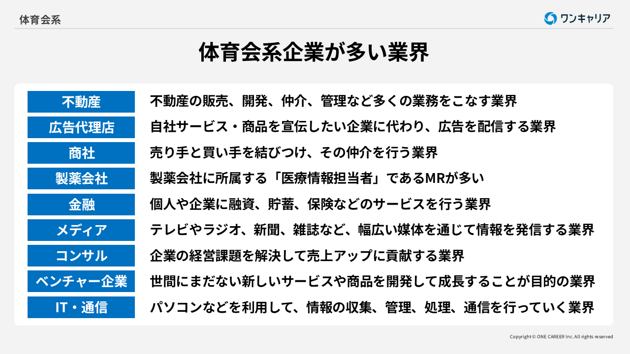 <目次> ●体育会系とは ・体育会系とは ・体育会系企業とは ・体育会系学生とは ●体育会系企業の特徴 ・スポーツ経験者が多い ・チャレンジしていく文化がある ・上下関係がしっかりとしている ・成果主義でインセンティブ制度が多い ・精神論・根性論がある場合もある ・飲み会などの業務時間外でのコミュニケーションが多い ・体育会系会社がブラックとは限らない ●体育会系企業が多い業界 ・不動産 ・広告代理店 ・商社 ・製薬会社(MR) ・金融 ・メディア ・コンサル ・ベンチャー企業 ・IT・通信 ●体育会系企業の見分け方 ・企業HPやSNSを見る ・クチコミサイトの評判を見てみる ・説明会やインターンに参加する ・OB・OG訪問をする ●体育会系企業に向いている人の特徴 ・礼儀が身についている人 ・ストレス耐性が強い人 ・体力がある人 ●体育会系企業に向いていない人の特徴 ・自分のペースで仕事を進めたい人 ・ワークライフバランスを重視したい人 ・会社の枠組みや上下関係が苦手な人 ・精神論・根性論が苦手な人 ●体育会系の人は就活に有利って本当? ●体育会系学生の特徴 ・体育会系学生の強み|自己PR例文付き ・体育会系学生の課題点 ●体育会系学生に人気の業界と職種 ・業界 ・職種 ●志望業界や職業、企業の見つけ方と選考対策 ・自己分析 ・業界研究、企業研究 ・説明会、インターンシップ ・ワンキャリアの活用方法 ●まとめ