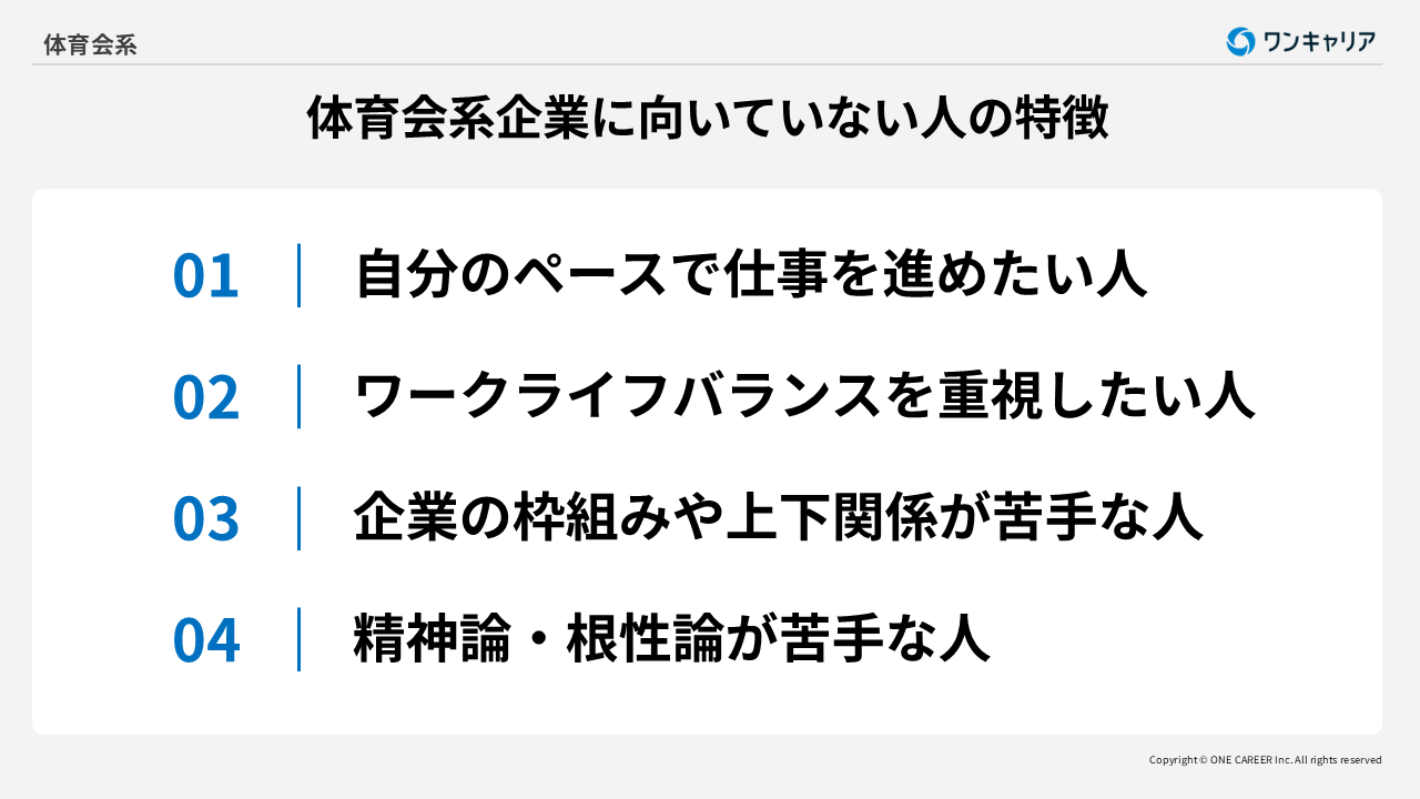 特に企業選びにおいて「体育会系企業」という言葉に過剰に反応する学生が増えている印象です。ですが、体育会系の特徴である「規律」や「チームワーク」は、多くの業界で高く評価されている要素です。一方で、それらの特徴が強く表れると、苦手に感じる方がいるのも確かです。