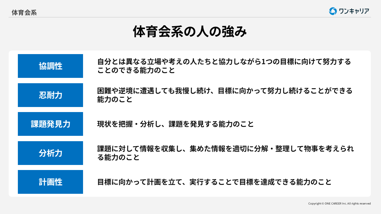 忍耐力とは困難や逆境に遭遇しても我慢し続け、目標に向かって努力し続けることができる能力のことを指します。1つの目標に向かって努力し続けることが重要な体育会系の団体に所属している人にとっての強みとなります。