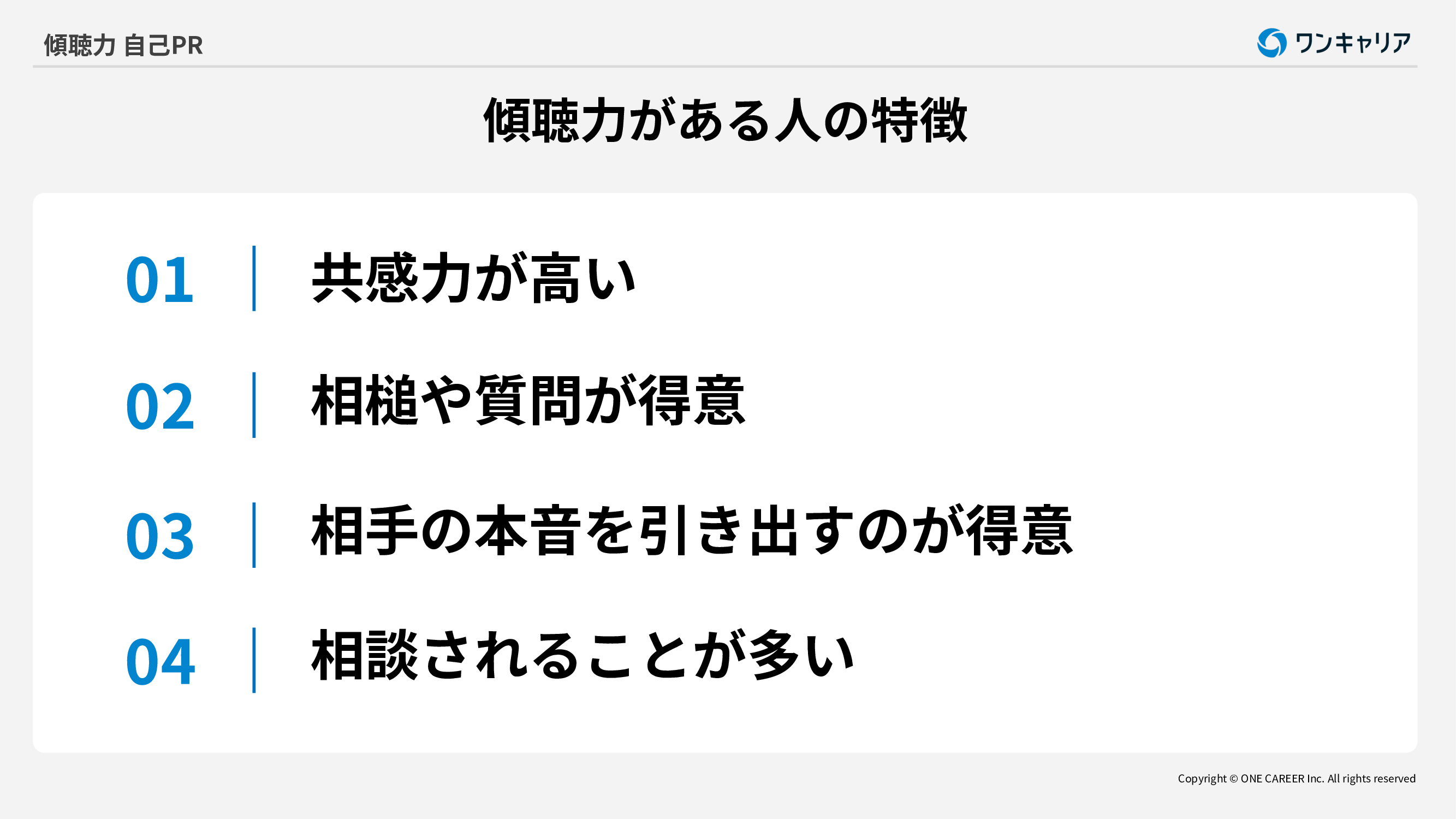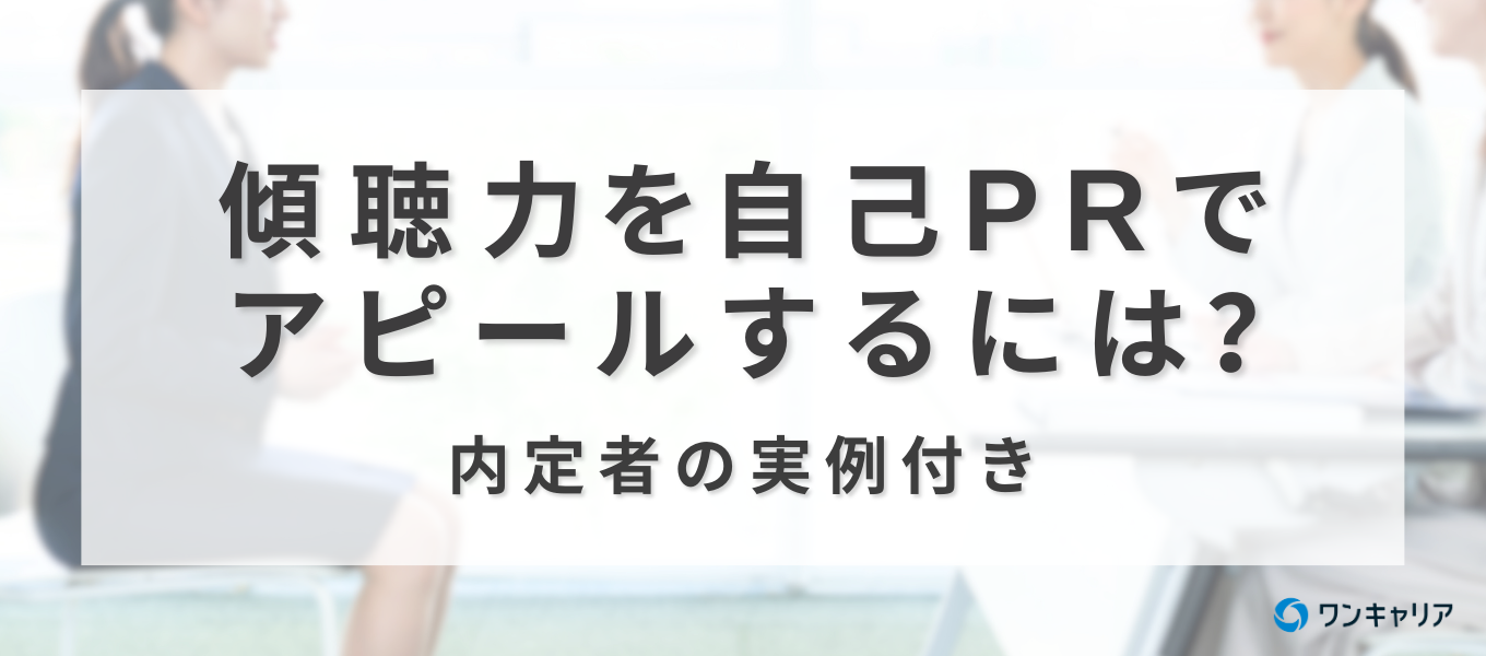 <目次> ●傾聴力とは?|傾聴力がある人の特徴も解説 ・傾聴力とは? ・:特徴1:共感性が高い ・:特徴2:相槌や質問が得意 ・:特徴3:相手の本音を引き出すのが得意 ・:特徴4:相談されることが多い ●企業が傾聴力を評価する理由3つ ・良好な関係を築くために必要な能力であるため ・相手の本音を引き出せるため ・問題解決に役立つため ●5ステップ|自己PRで傾聴力の効果的な伝え方 ・ステップ1:最初に結論を伝える ・ステップ2:具体的なエピソードを伝える ・ステップ3:数値などを用いて成果を伝える ・ステップ4:傾聴力がどう役立ったかを伝える ・ステップ5:会社でどう生かせるかを伝える ●傾聴力をアピールするときのポイント5つ ・企業が求めている能力であるかを確かめる ・他の強みとセットで伝える ・傾聴力を他の言い方で伝える ・面接での振る舞いに気を付ける ・受け身の印象を残さないようにする ●【業界別】傾聴力を用いた内定者の例文 ・金融 ・メーカー ・広告 ・インフラ ・商社 ・不動産 ●【職種別】傾聴力を用いた内定者の例文 ・営業職 ・事務職 ・エンジニア職 ・コンサルタント職 ・クリエイティブ職 ●【エピソード別】傾聴力を用いた内定者の例文 ・アルバイト ・部活 ・ゼミ ●まとめ