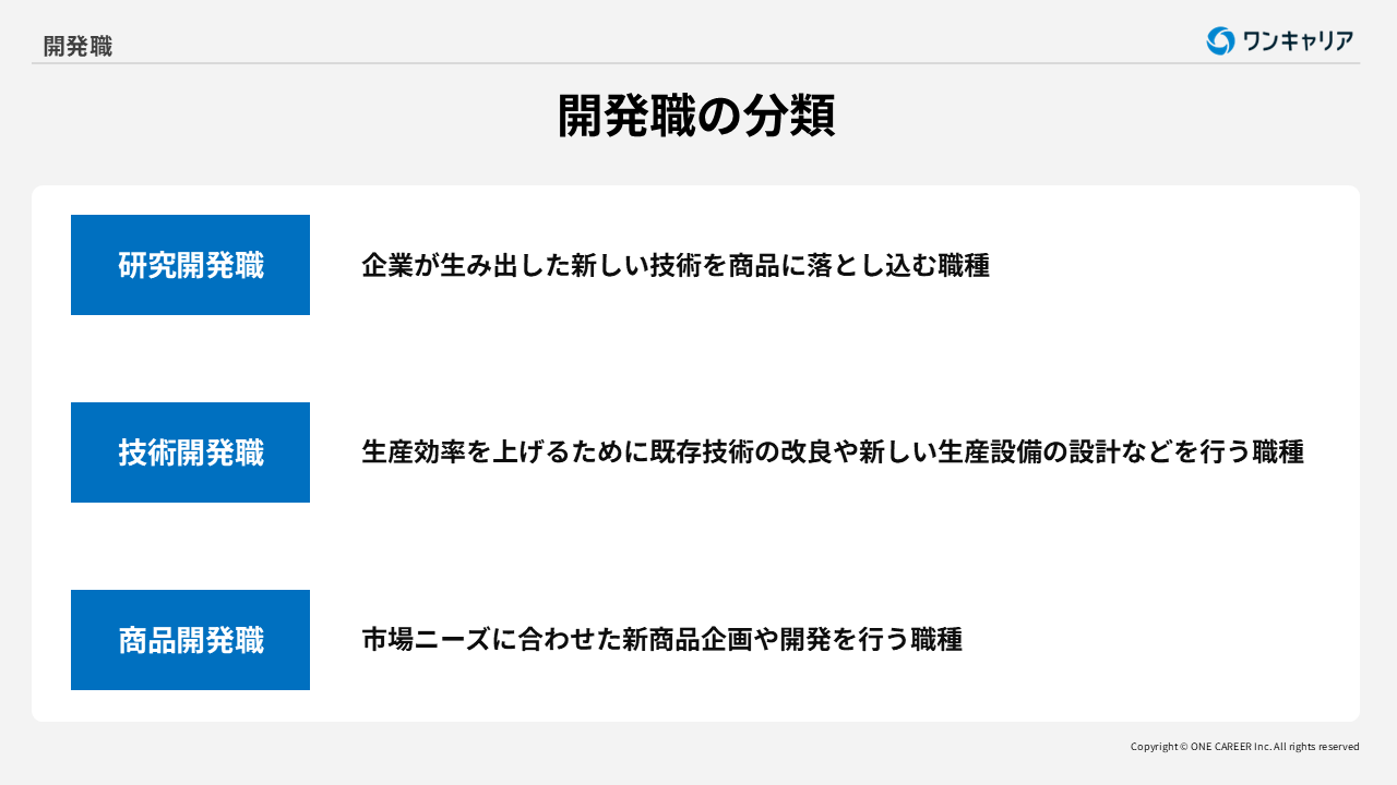 開発職は大きく分けて3つに分類でき、それぞれの開発職は、異なる目的や役割を持っています。