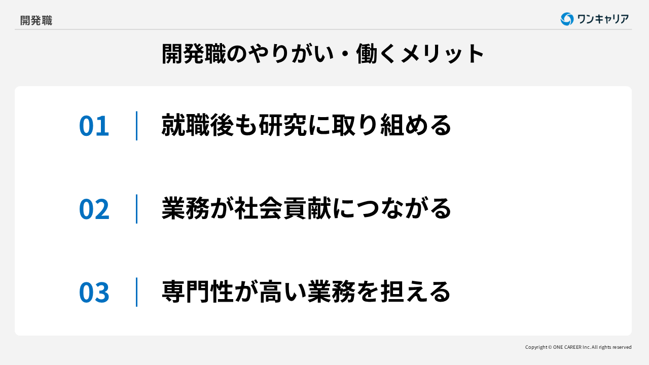 開発職のやりがいと働くメリットは、主に以下の3つです。
