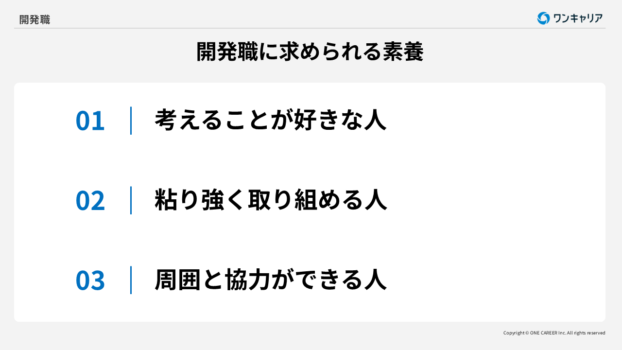 求められる素養については、以下3つの特徴が挙げられます。どの素養についても、開発職の業務特性上重要となるので、自身が開発職に向いているか判断するよい指標となるでしょう。