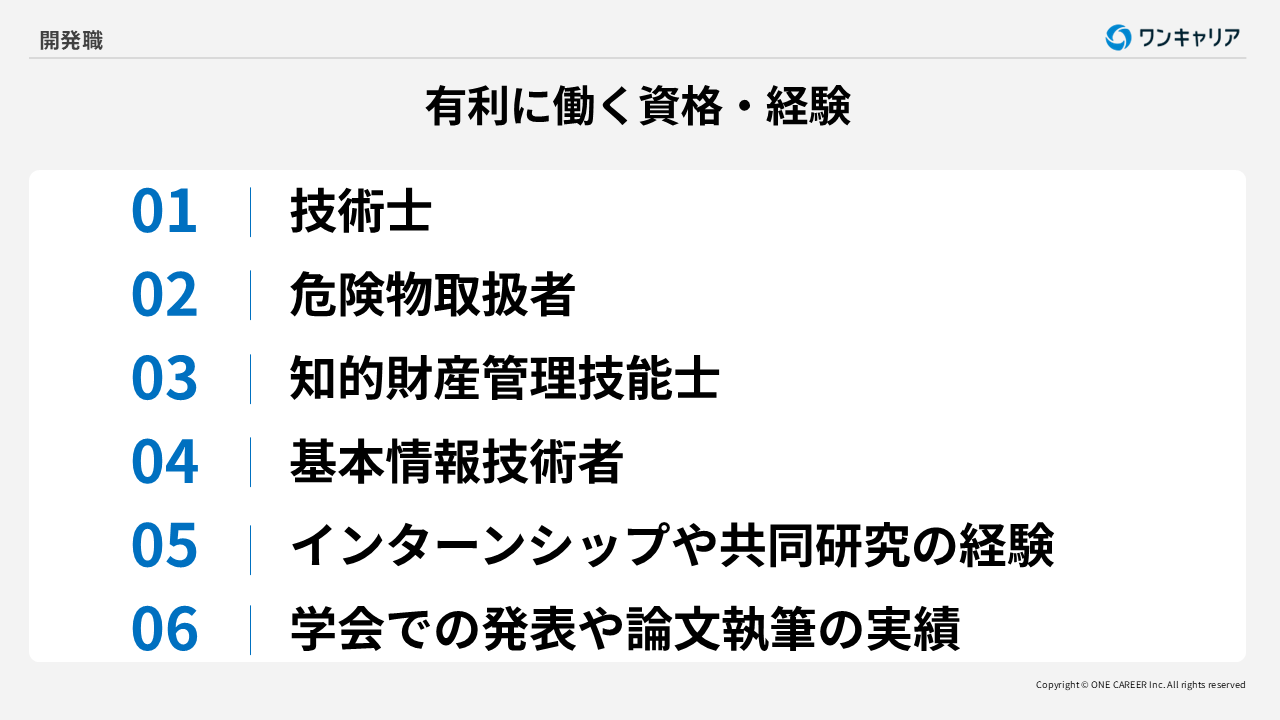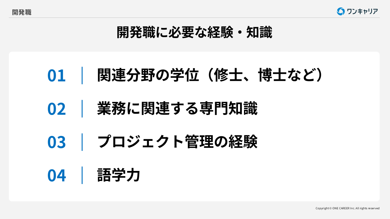 開発職で必要な専門的な経験や知識は以下の通りです。
