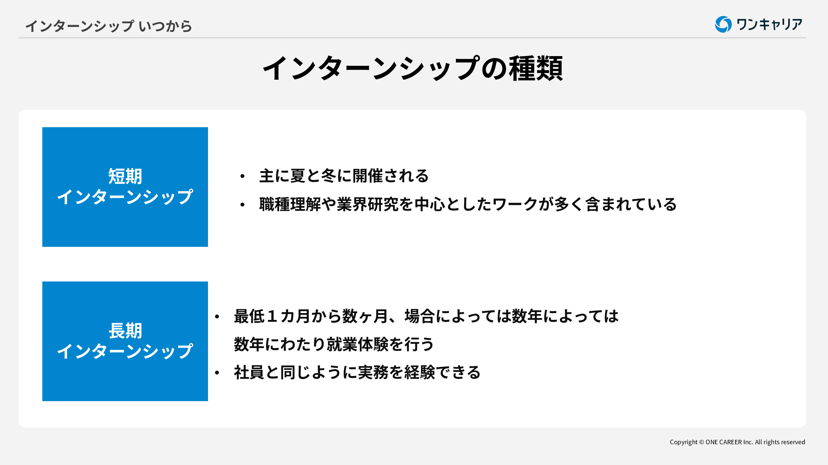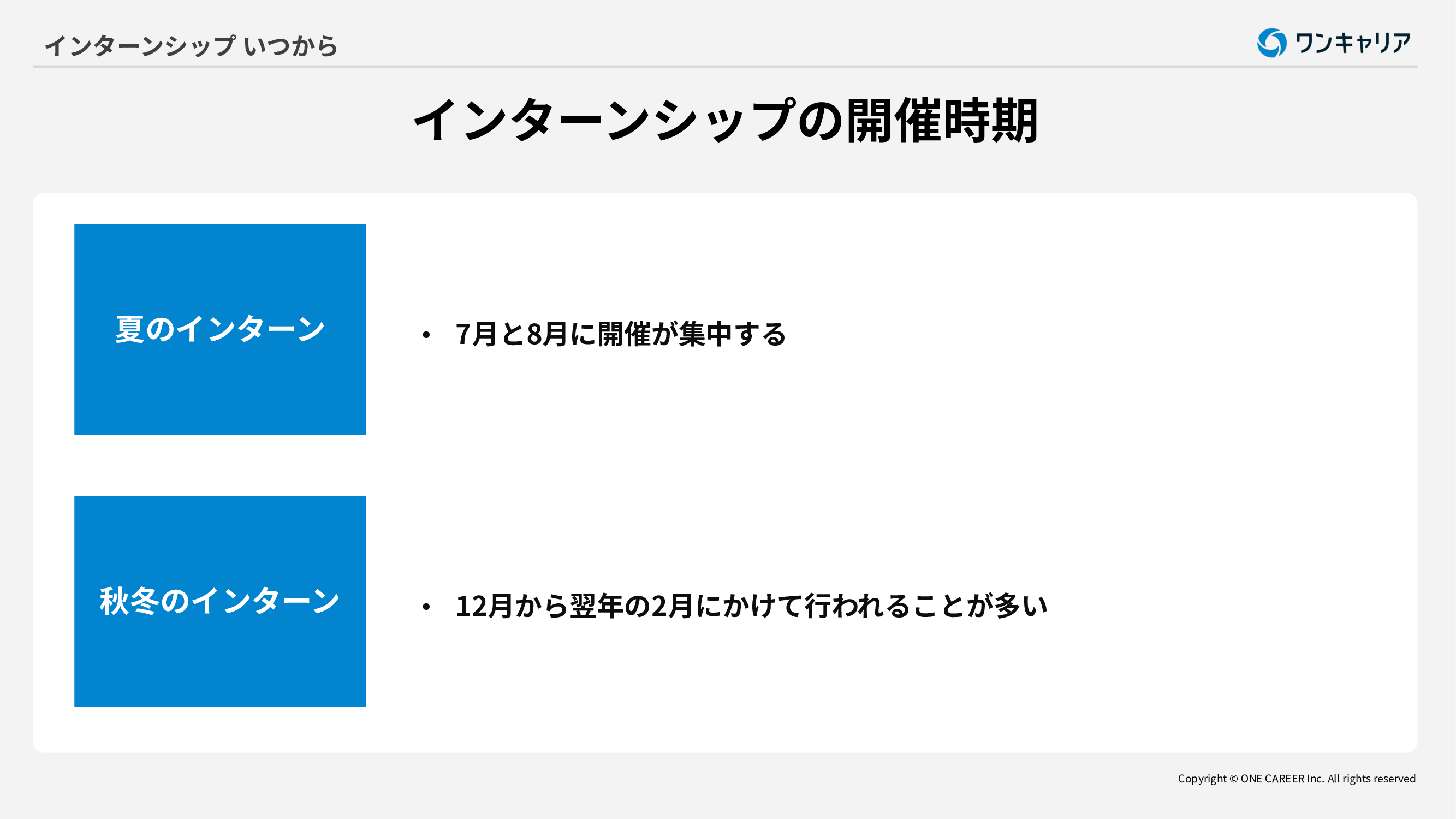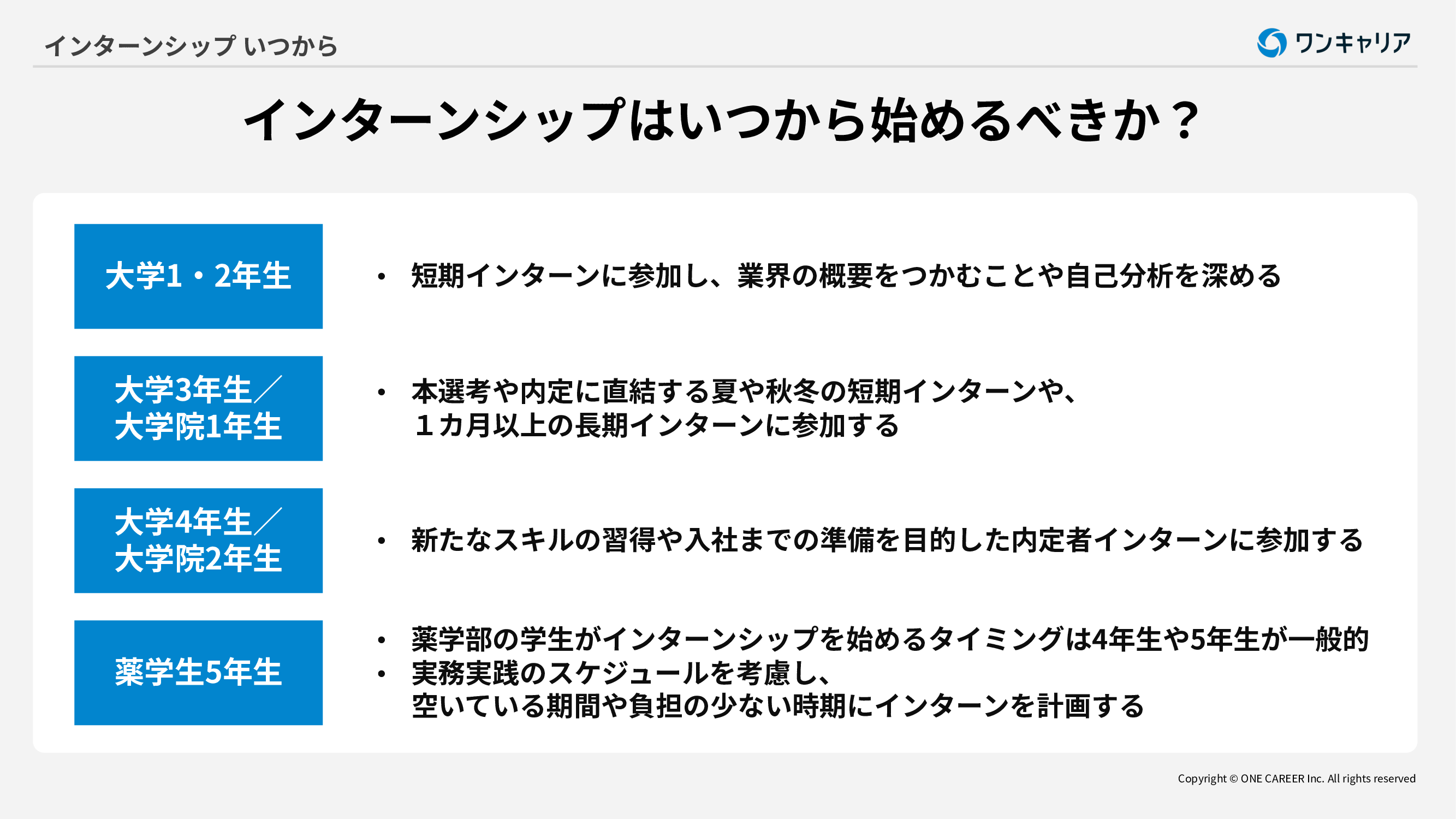大学3年生または大学院1年生は夏や秋冬の短期インターンや1カ月以上の長期インターンに参加することが一般的です。
