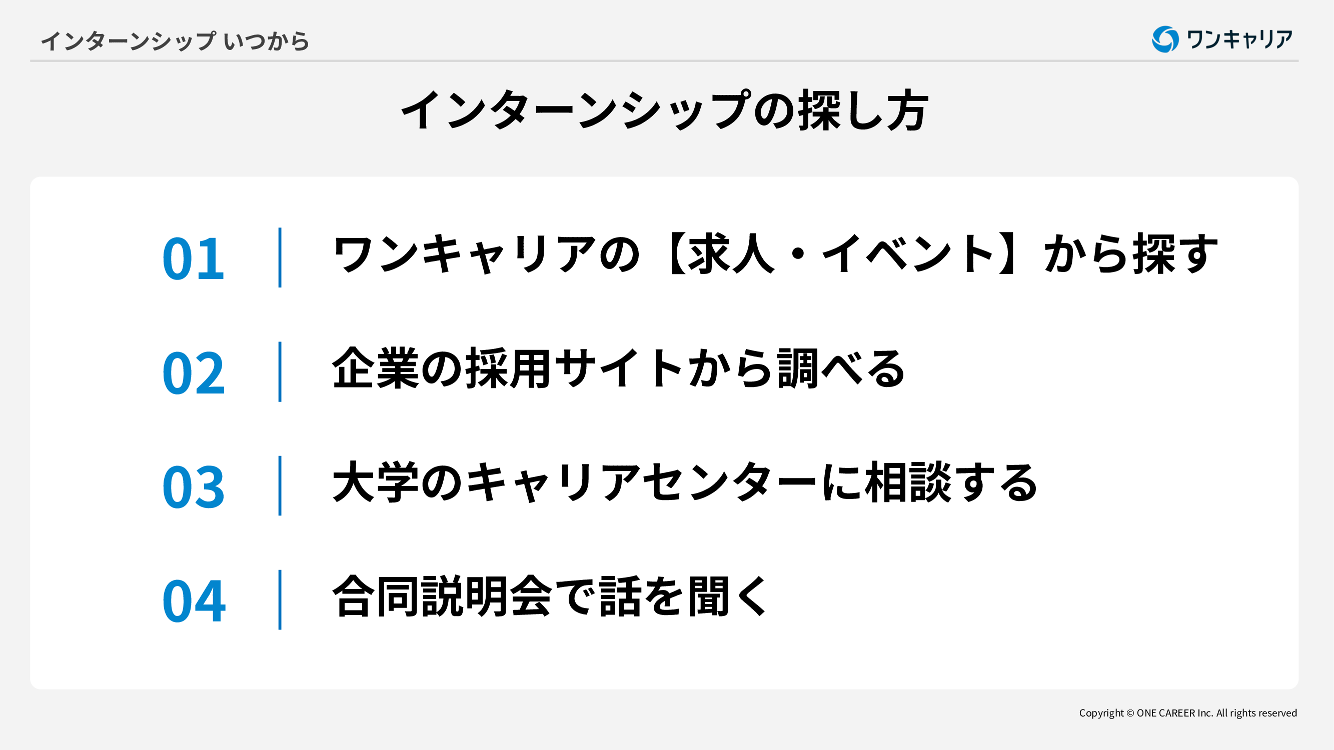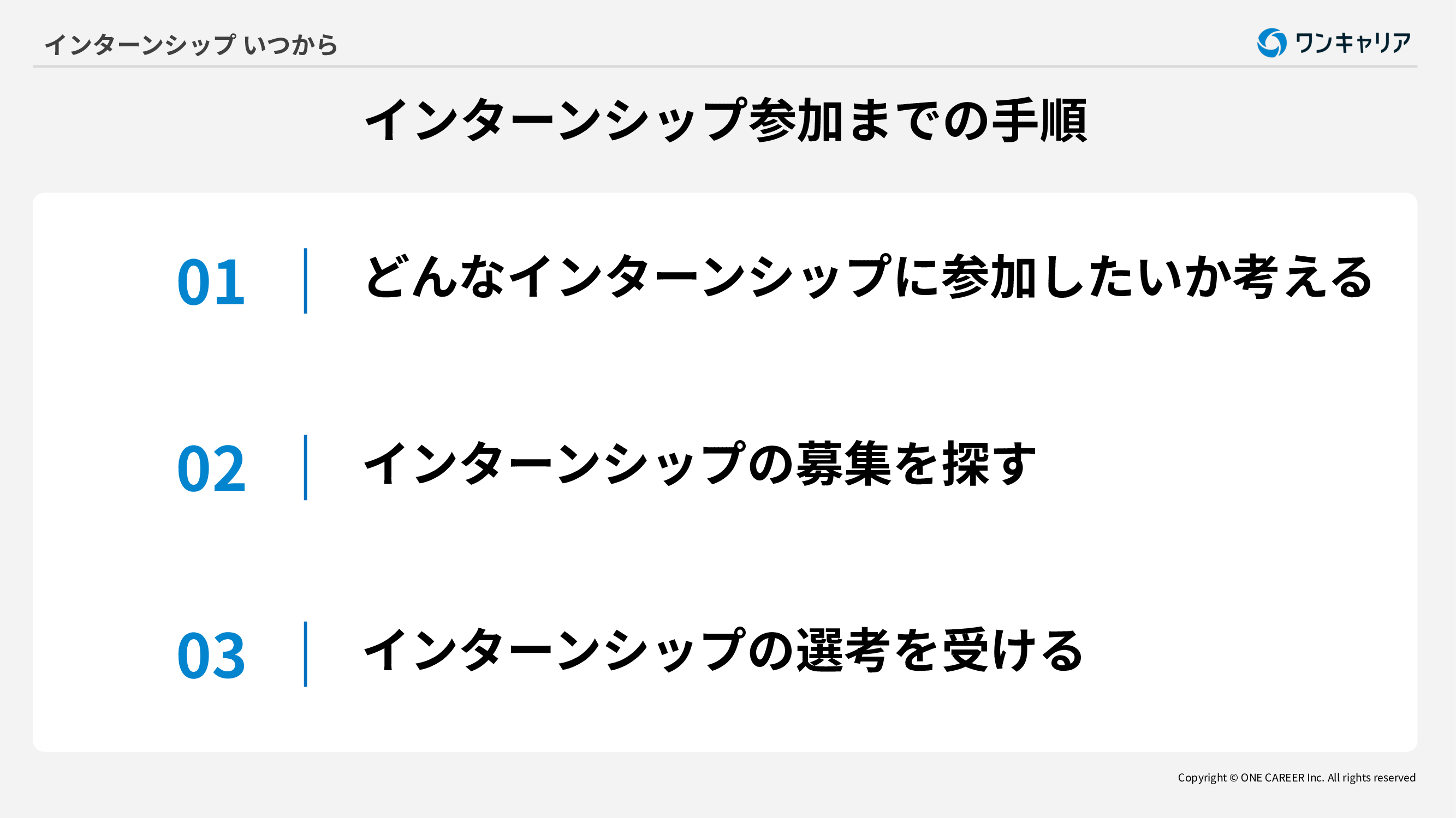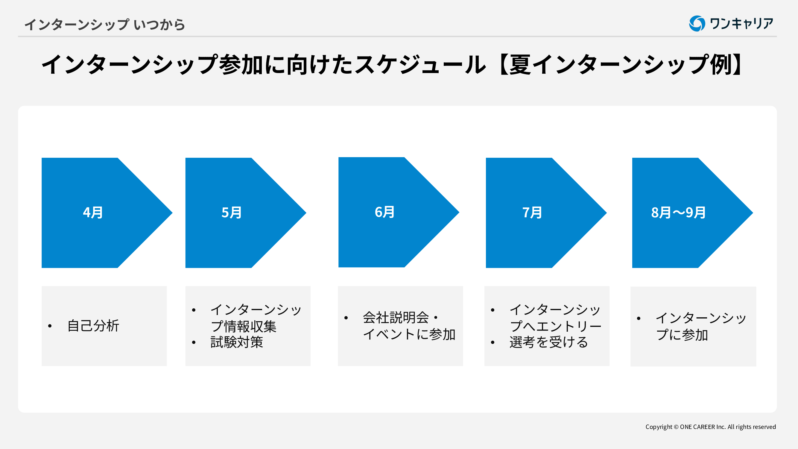 大学3年生または大学院1年生は夏や秋冬の短期インターンや1カ月以上の長期インターンに参加することが一般的です。