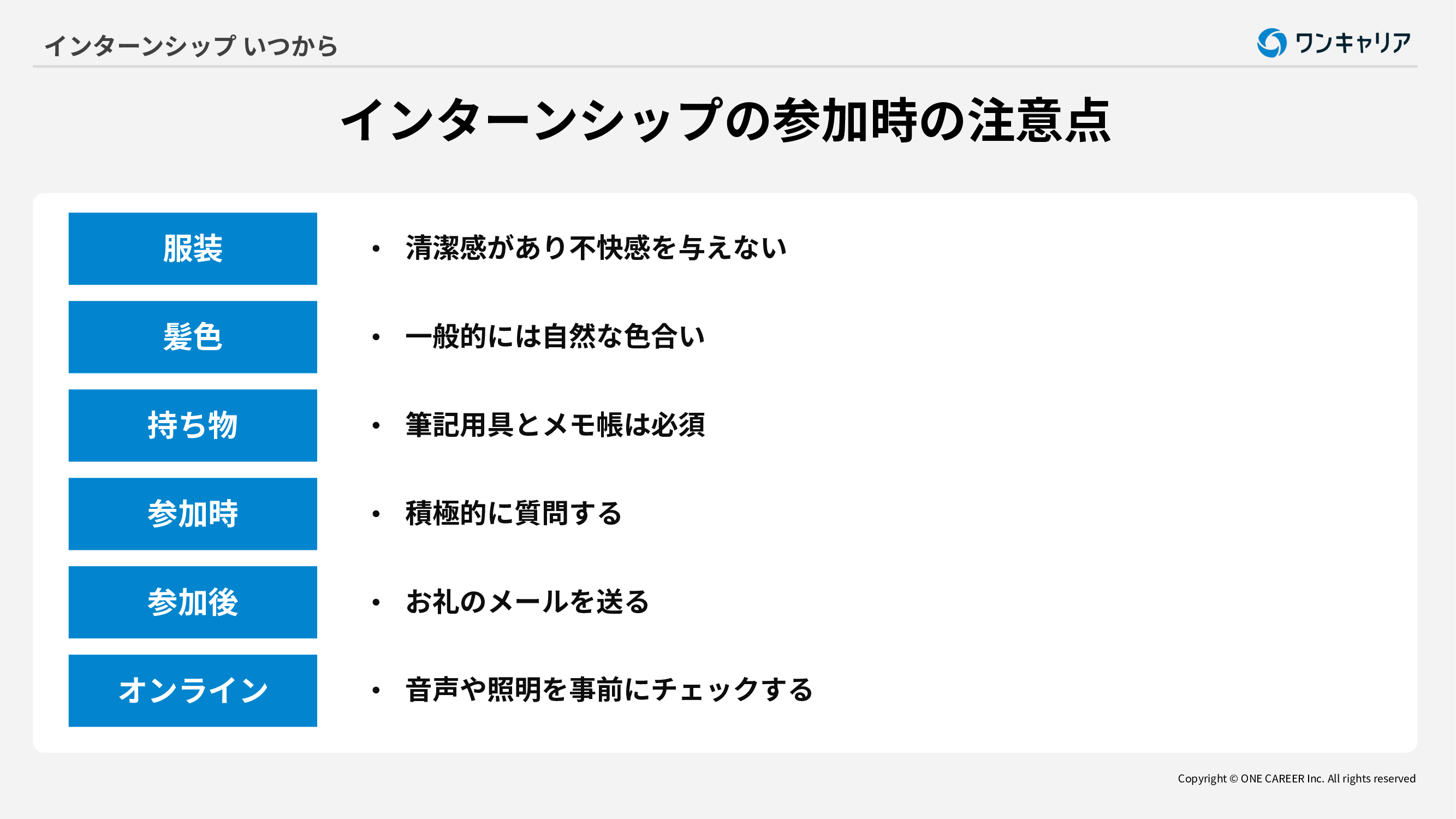 インターンへの参加が決まったものの当日の服装や持ち物が分からない人もいるのではないでしょうか。そこで、参加する際に気をつけたいポイントについて解説します。