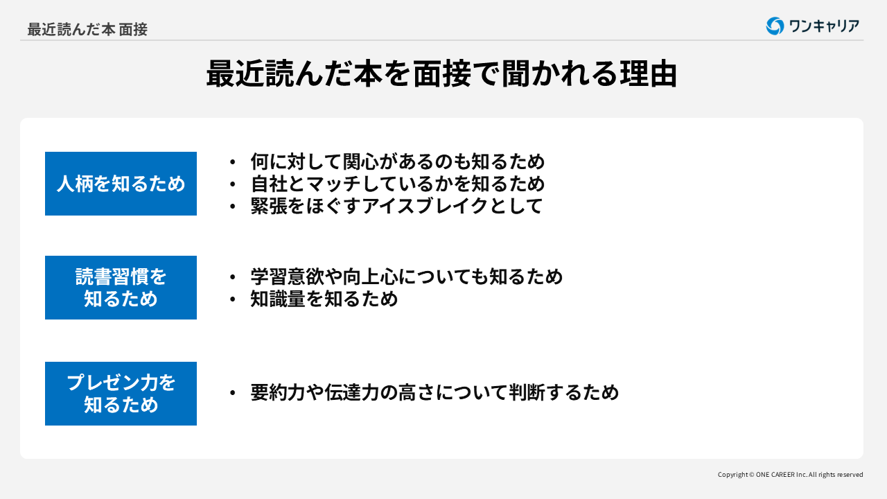 このように、面接官は「最近読んだ本」を通じて、就活生の知的能力や仕事への準備度を測ろうとしているといえます。