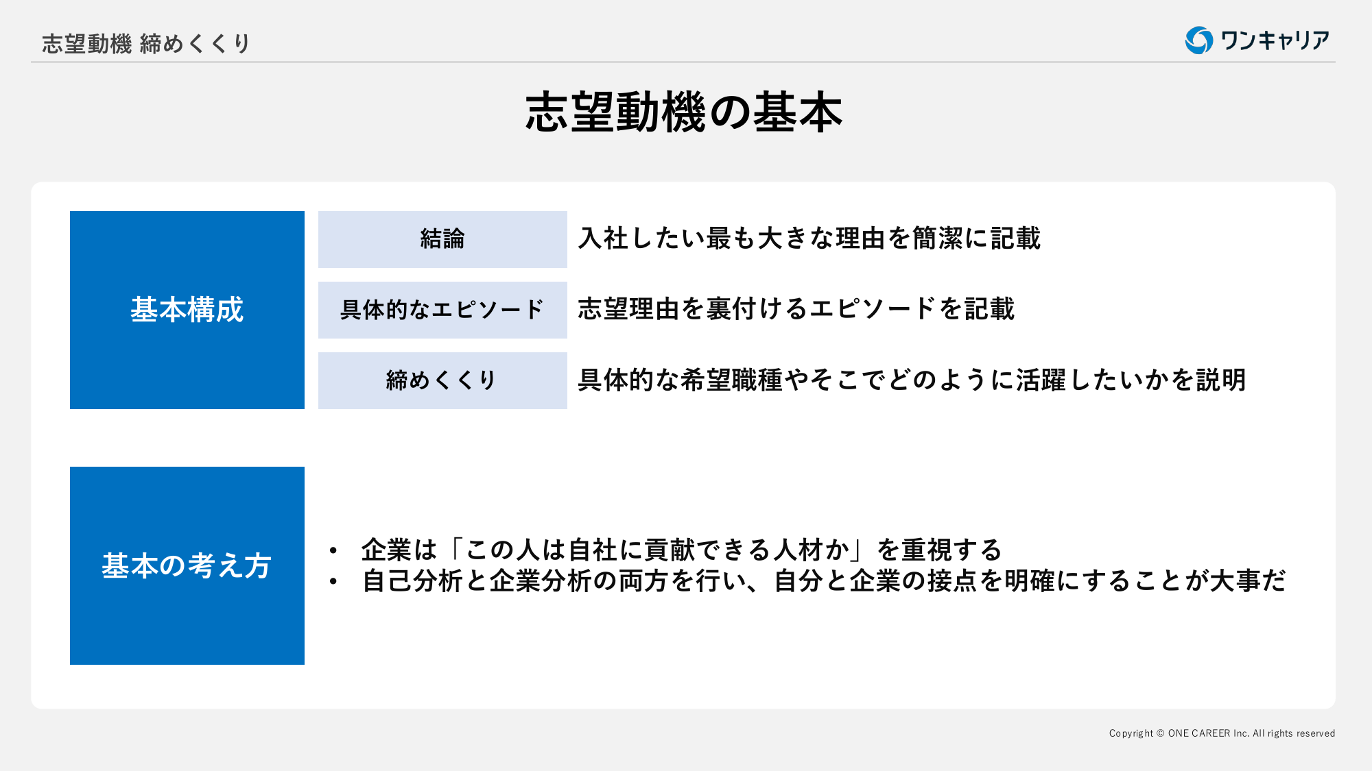 志望動機の基本的な構成は結論→具体的なエピソード→締めくくりです。