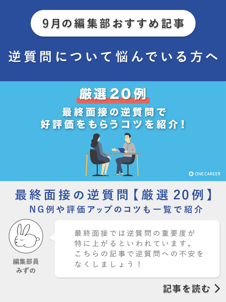 こちらの記事では、最終面接の逆質問で使える質問例や、他の学生と差をつけるテクニック、避けるべき質問などをご紹介しています。最終面接の逆質問を考えるにあたって押さえておくべきポイントや伝え方のテクニックも多数ご紹介しているので、ぜひ参考にしてください。