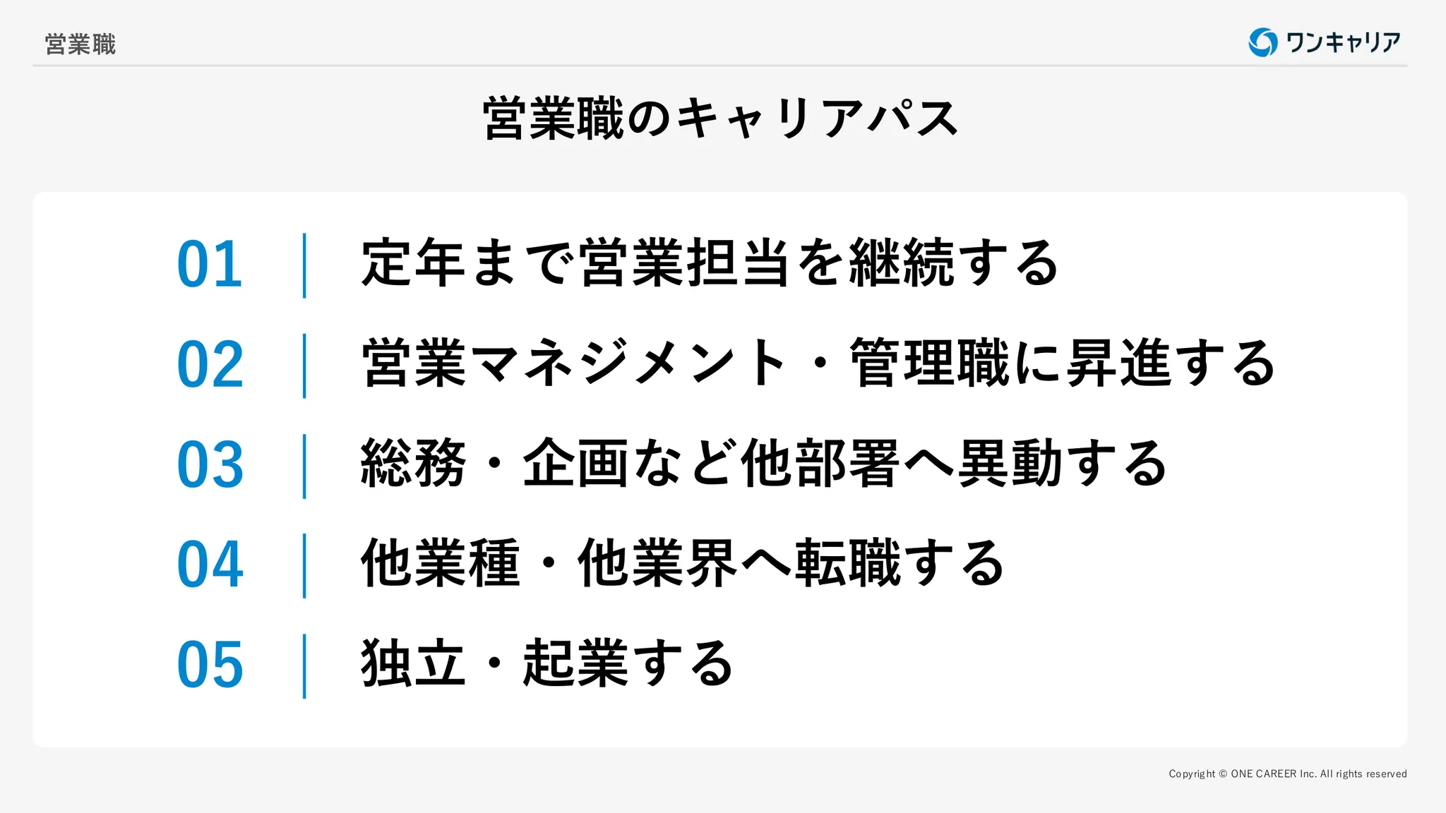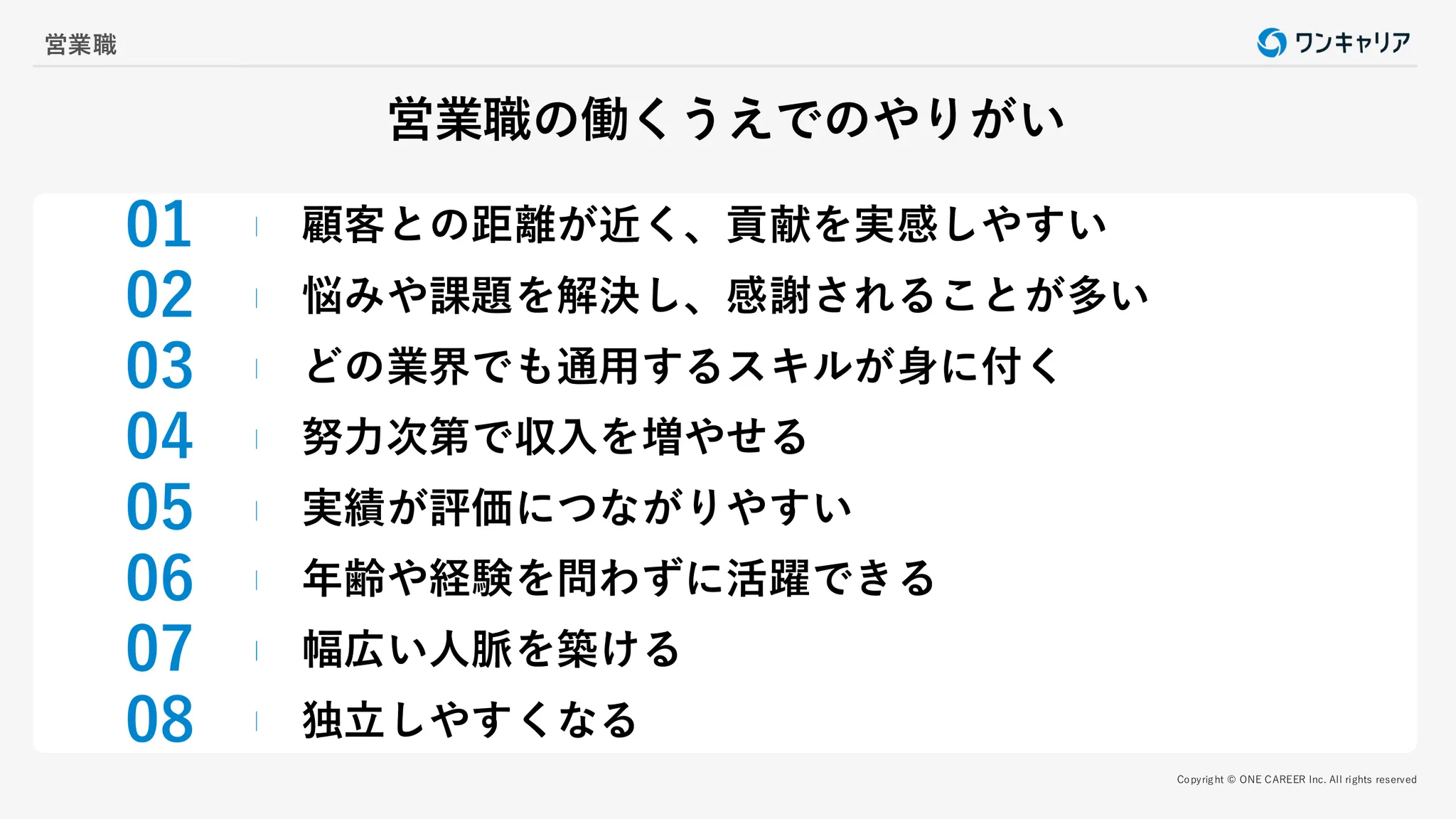 本記事では、営業職の種類や仕事内容、向いている人の特徴、やりがい、年収、将来性、選考対策について詳しく紹介しました。