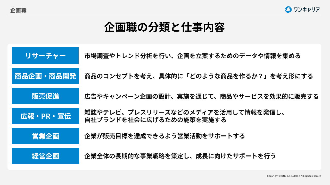 ここでは、企画職をいくつかの分類に分け、具体的な仕事内容を詳しく解説します。なお、各職種の難しさや必要なスキルについても解説しており、企画職に求められる人物像を深く理解できるので、参考にしてみてください。