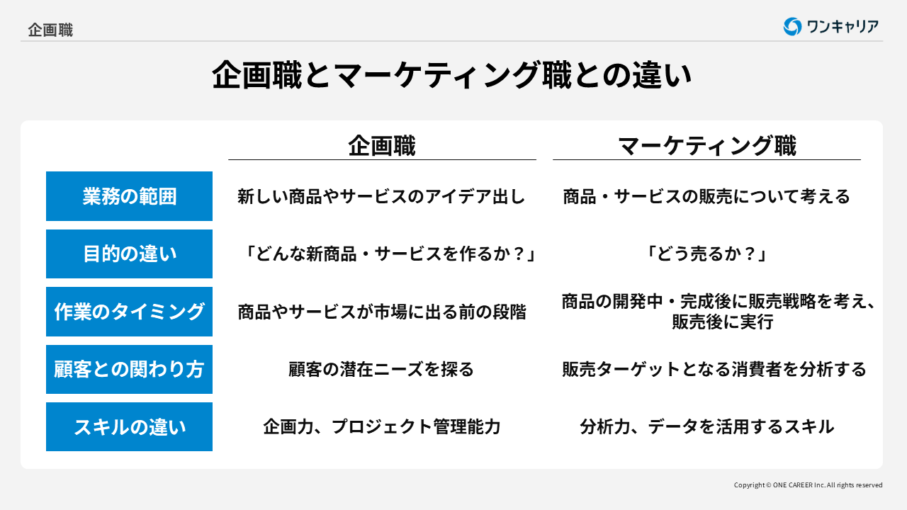 ここでは、企画職とマーケティング職の5つの違いをご紹介します。