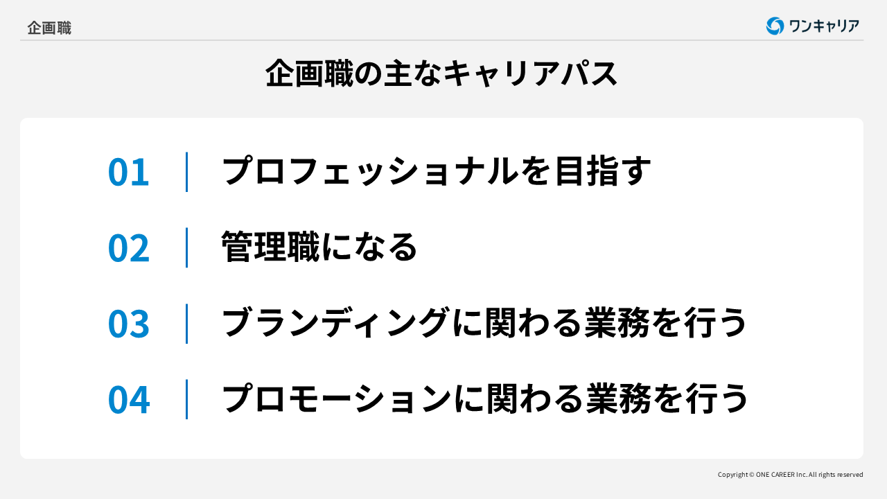 また、企画職はマーケティング・営業・経営など幅広い知識やスキルを身に付けられるため、キャリアの可能性も豊富です。将来的にはマネジメントや新規事業開発、ブランディングなど、さまざまな方向にステップアップできます。