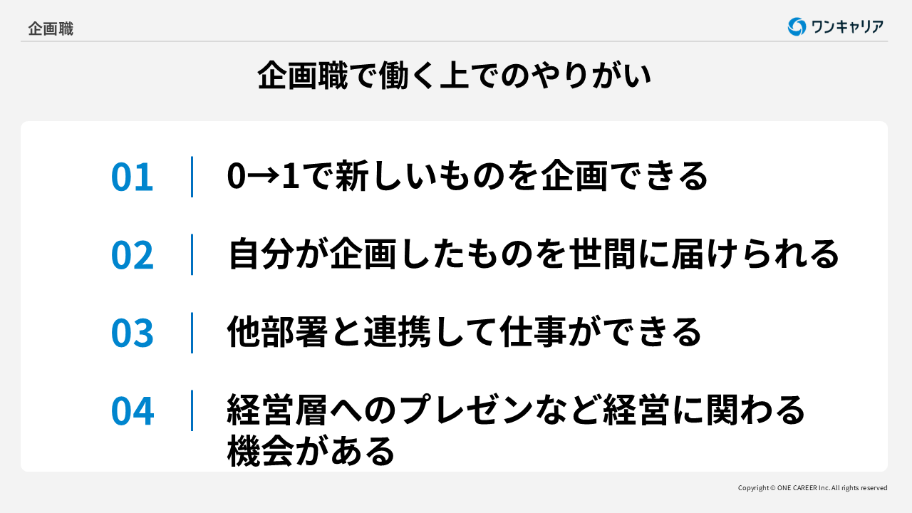 企画職は、商品のコンセプトを社内外で説明する機会が多い業務です。特に経営層向けの企画プレゼンでは、承認を得るために商品内容を分かりやすく説明したり、売上が上がる根拠を論理的に伝えたりする必要があります。このように、プレゼン次第で採用の可否が左右されるため、説得力のあるプレゼンテーションスキルが重要です。