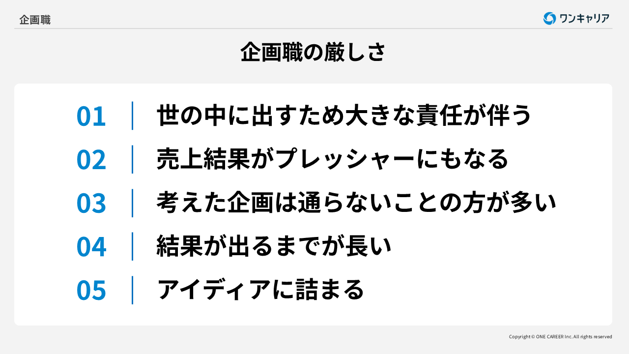 企画職の仕事は、アイデア出しから商品企画、販売に至るまでを年単位で進めることもあります。この仕事の過程では、企画が順調に進まないケースもあるでしょう。そうした中でも、諦めずに努力を続ける忍耐力が求められます。