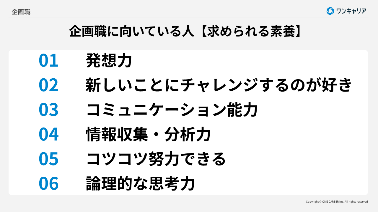 企画職は、論理的に物事を考え、問題を解析する能力が求められます。論理的な思考力は、企画職で情報分析や企画立案などを行う際に必須です。例えば、市場の調査結果をもとに「◯◯という結果を見ると××のニーズがあると予想できるので□□という商品を作ろう」などと考えることもあります。