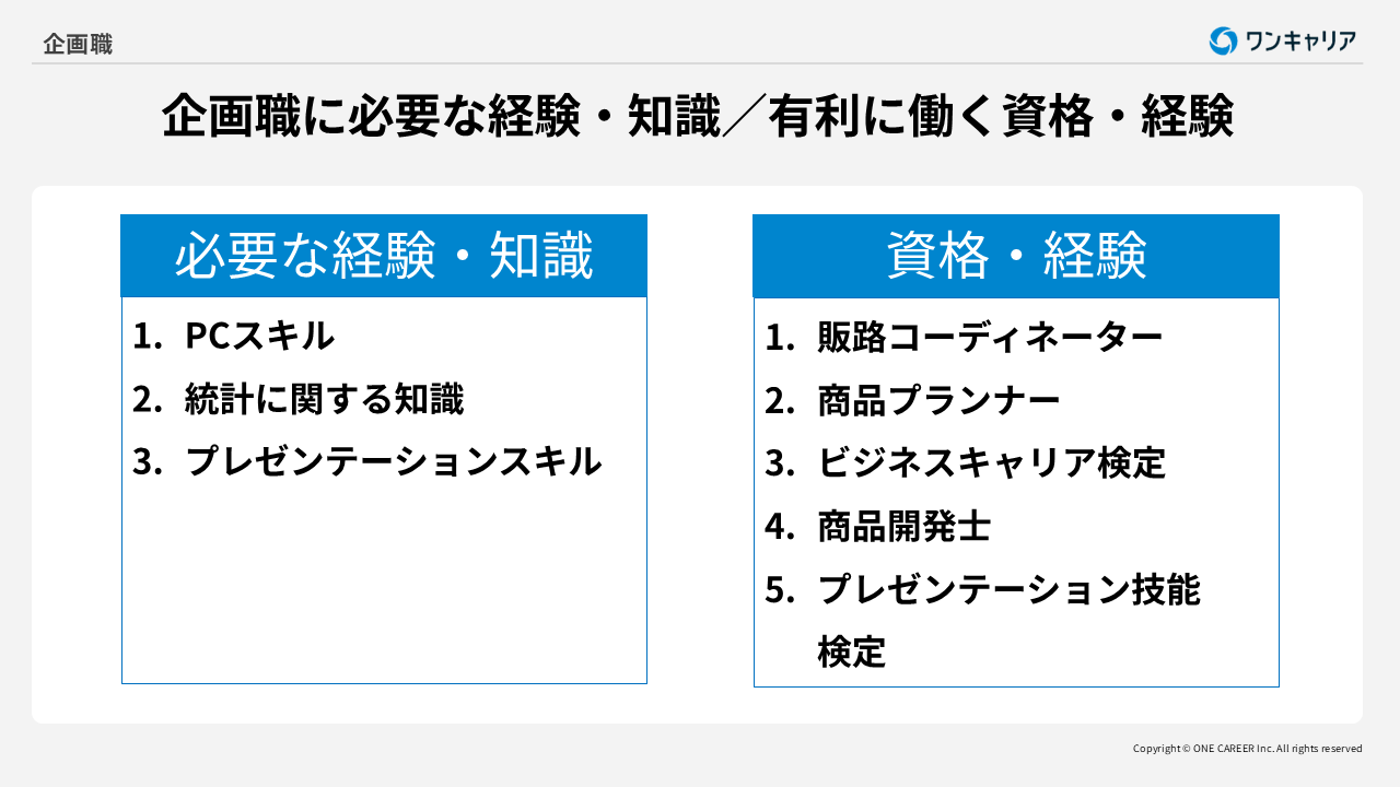 ここでは、企画職に求められる経験や知識を3つご紹介します。