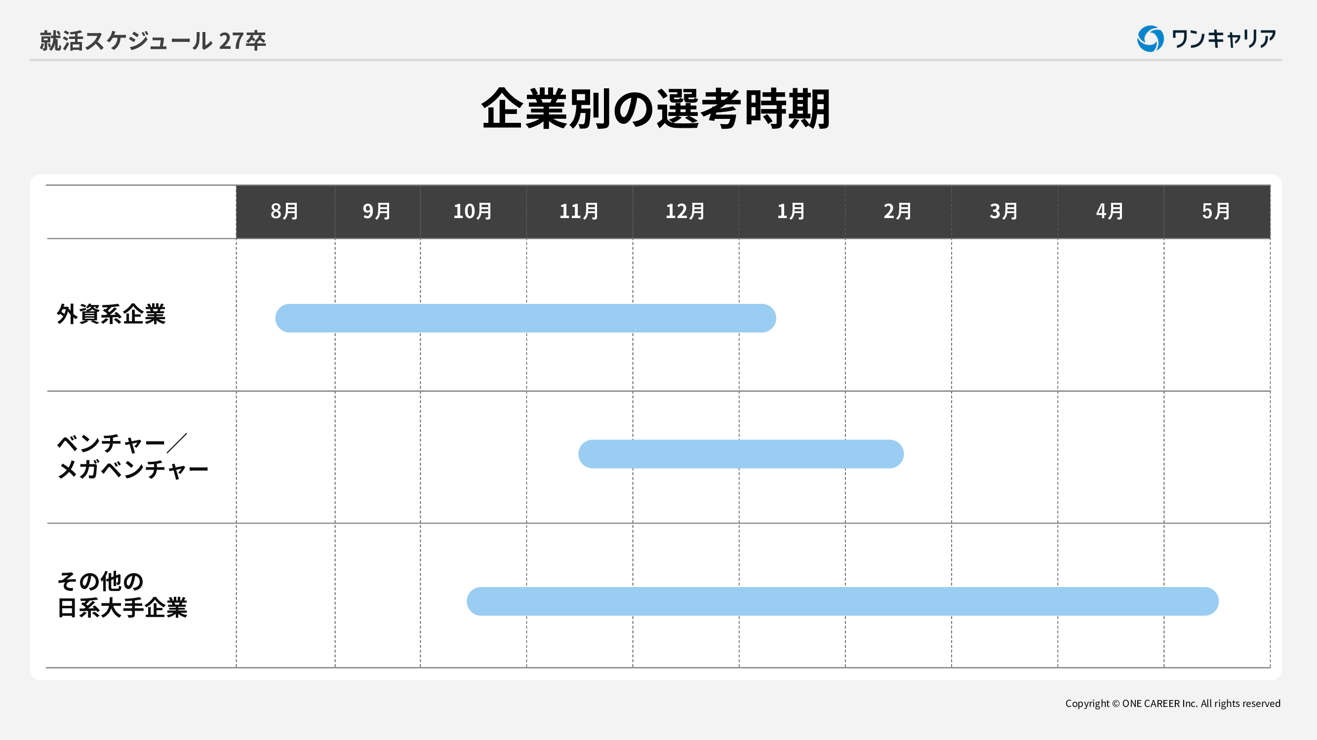 ▼外資系戦略コンサル(ボストン コンサルティング グループ(BCG)) ・インターン選考〜本選考:5月中旬〜8月中旬 ・内定:9月上旬 ※出典:BCG|2025年卒経営コンサルタントの選考ステップ ▼外資系総合コンサル(アクセンチュア) ・インターン選考〜本選考:6月上旬〜10月中旬 ・内定:10月下旬 ※出典:アクセンチュア|2025年卒戦略コンサルタント職の選考ステップ ▼外資系メーカー(P&G Japan) ・インターン選考〜本選考:6月下旬〜9月下旬 ・内定:9月上旬 ※出典:P&G Japan|2025年卒F&A(経営管理)の選考ステップ ▼外資系投資銀行(モルガン・スタンレー) ・インターン選考〜本選考:11月上旬〜1月上旬 ・内定:1月上旬 ※出典:モルガン・スタンレー|2025年卒投資銀行の選考ステップ