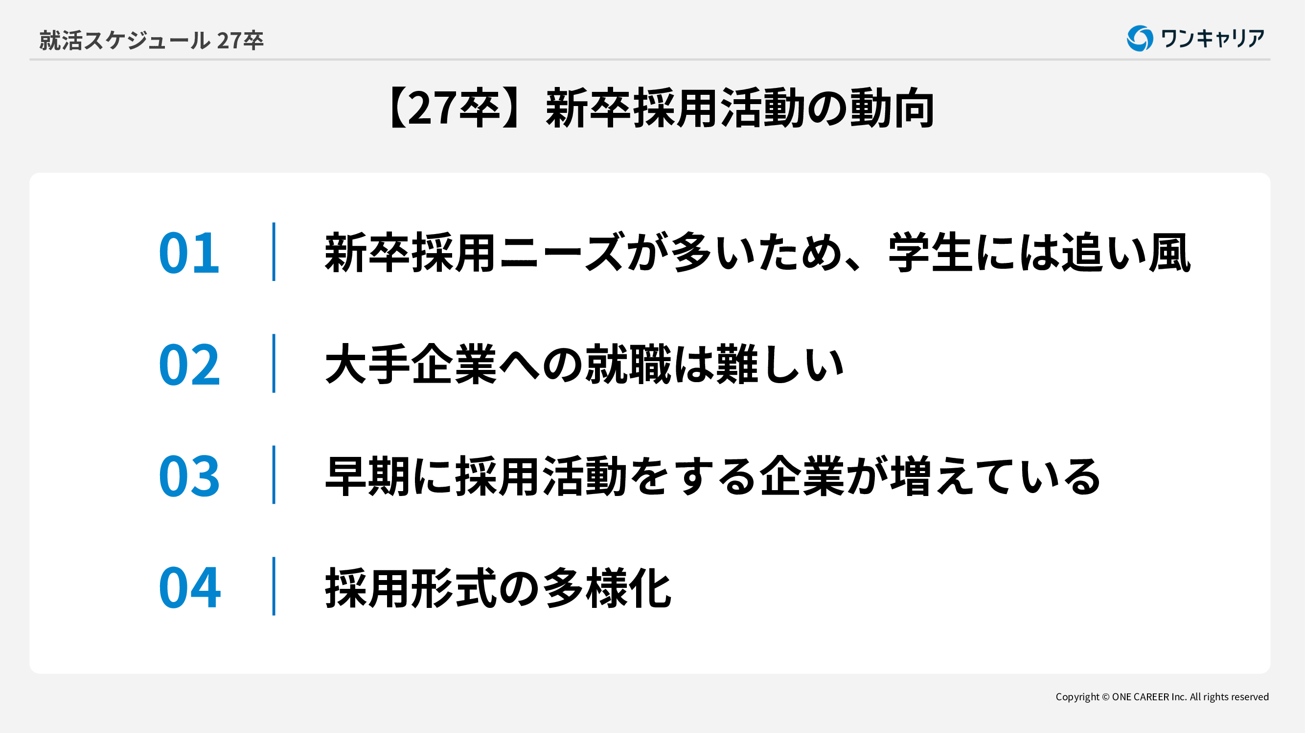 こちらでは、27卒が就活を進める際に、現在、企業の新卒採用市場でどのようなことが起きていて、トレンドになっているかについて詳しく解説します。