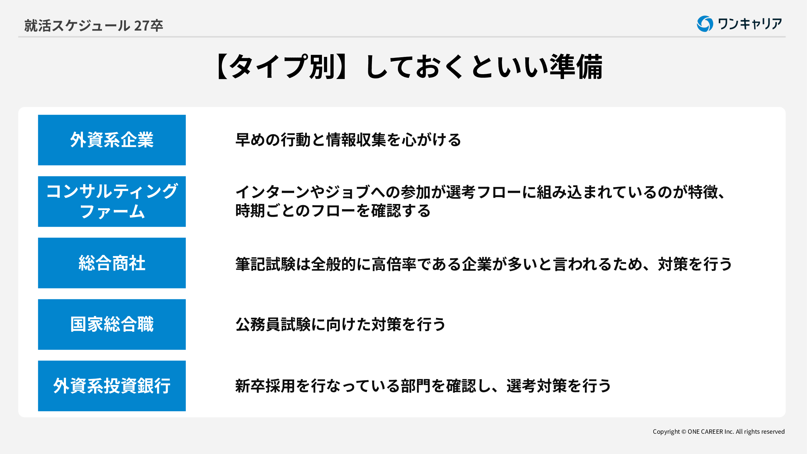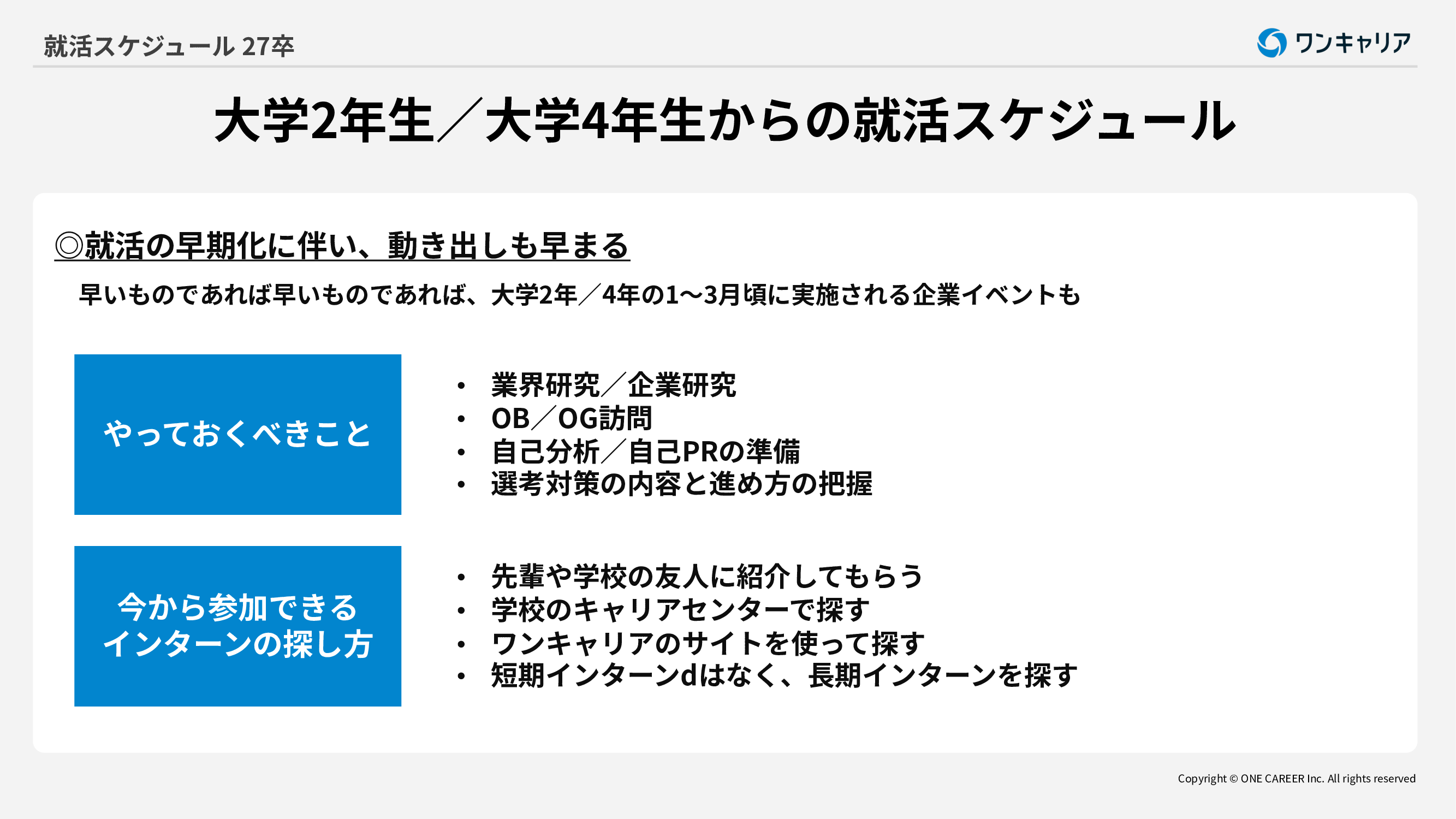 <目次> ●2027年卒とは何年生? ●【27卒】新卒採用市場の動向 ・新卒採用ニーズが多いため、学生には追い風 ・大手企業への就職は難しい ・早期に採用選考をする企業が増えている ・採用形式の多様化 ●27卒就活のスケジュール ・大学3年生/修士1年生からの就活スケジュール ・大学2年生/大学4年生からの就活スケジュール ●企業の選考スタート時期と内定が出るタイミング ・【8月〜1月】外資系企業の選考スケジュール(BCG、アクセンチュア、P&G Japan、モルガン・スタンレー) ・【11月〜2月】ベンチャー/メガベンチャーのスケジュール(サイバーエージェント、Visional(ビズリーチ)) ・【10月〜5月】その他の日系大手企業のスケジュール ●就活を有利に進めるためのポイント ・就活早期スタートのメリット ・企業が求める人材を把握する ・インターンの重要性と内定との関係性 ・ワンキャリアスカウトに登録する ●【全員共通】今からできる準備 ・業界研究/企業研究 ・OB・OG訪問 ・説明会に参加する ・自己分析/自己PRの準備 ・選考対策の内容と進め方の把握 ●【タイプ別】しておくといい準備 ・外資系企業を目指す人向けの準備 ・コンサルティングファームを目指す人向けの準備 ・総合商社を目指す人向けの準備 ・国家総合職を目指す人向けの準備 ・外資系投資銀行を目指す人向けの準備 ●27卒就活についてよくある質問 ・「早期選考」って何? ・やりたい仕事は明確に決めておくべきか? ・内定はいつ頃までにもらえる? ・就活のために特別な経験を積む必要があるか? ・就活でまずやるべきことは? ・就活にAIを使ってはいけない? ●おわりに