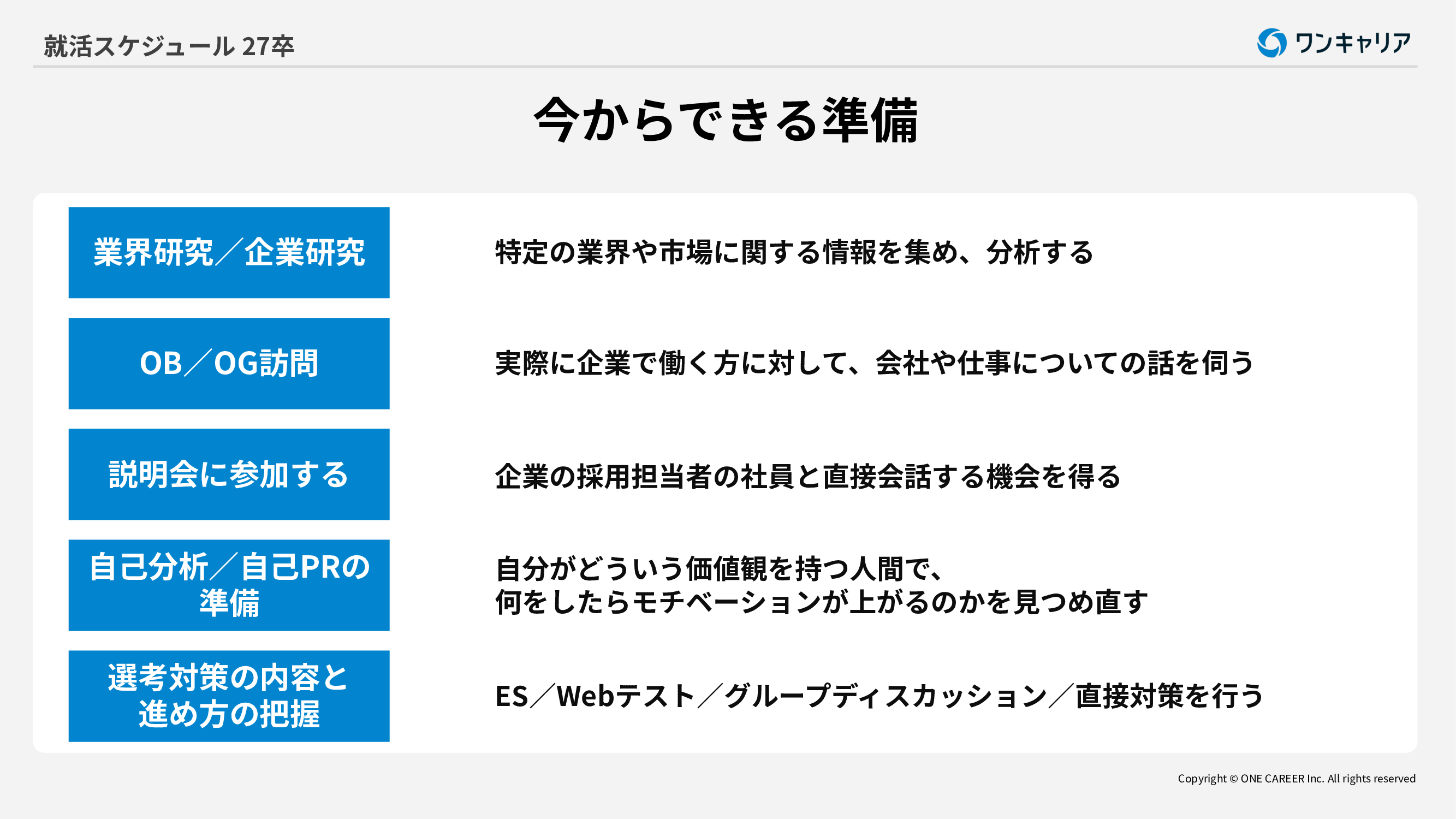 ・業界研究/企業研究 ・OB・OG訪問 ・自己分析/自己PRの準備 ・選考対策の内容と進め方の把握