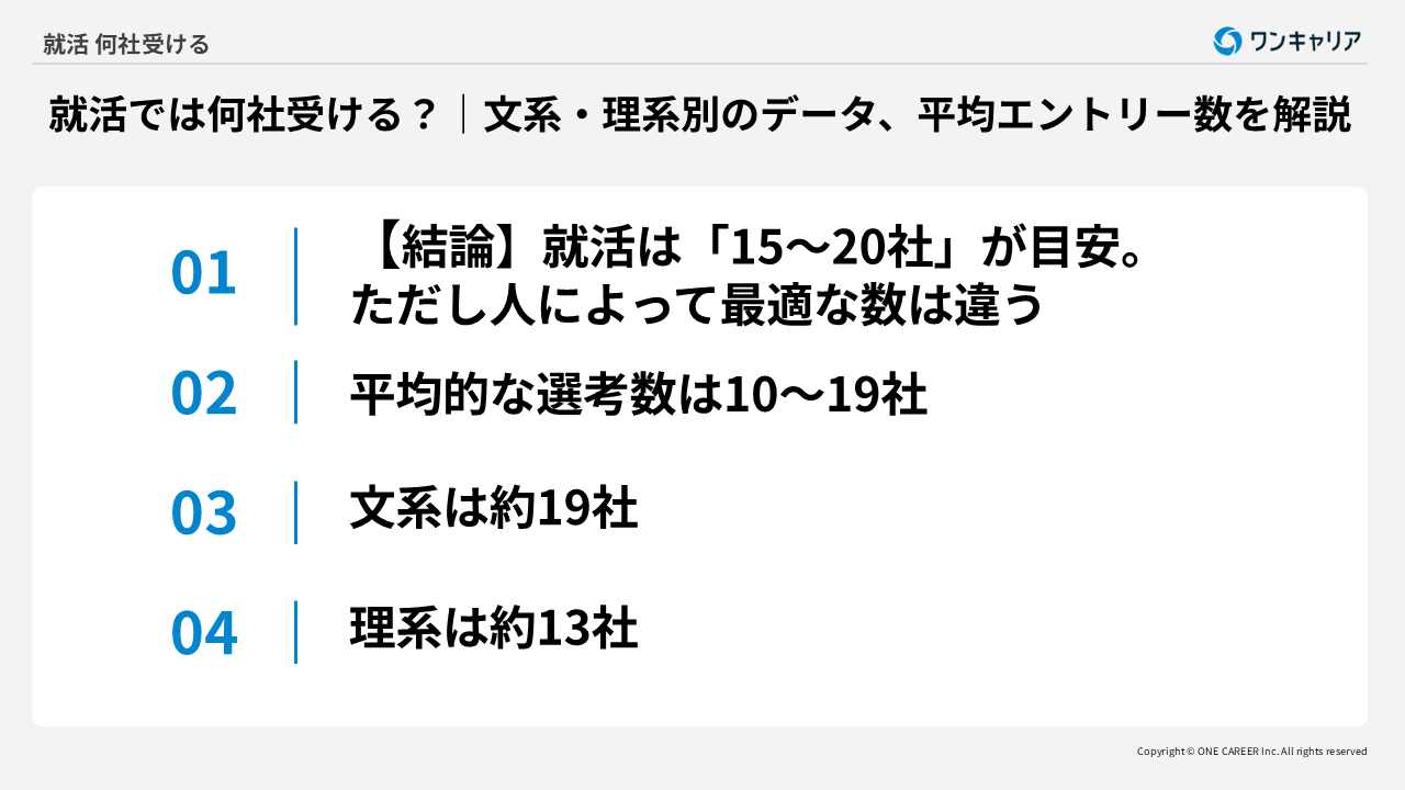 詳細は後ほど詳しく解説しますが、就活生の平均的な選考企業数は10〜19社程度であり、文系学生では約19社、理系学生では約13社といった数値が見受けられています。つまり、15~20社という数は文系理系を含めた幅広い層において妥当な目安と言えます。