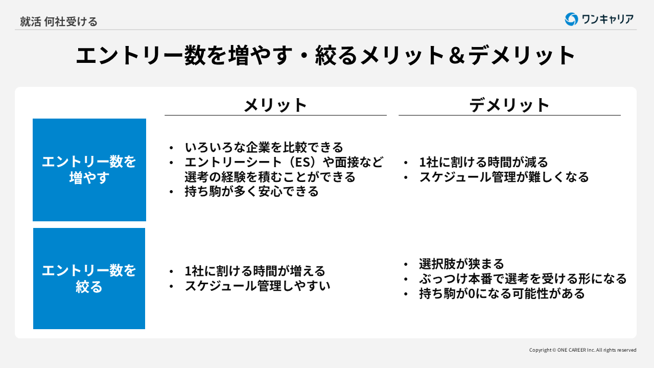 受ける企業数を減らすことで1社ごとの対策に力を入れられる反面、採用倍率が高い企業が多いため、どれだけ準備をしても落ちる可能性は避けられません。
