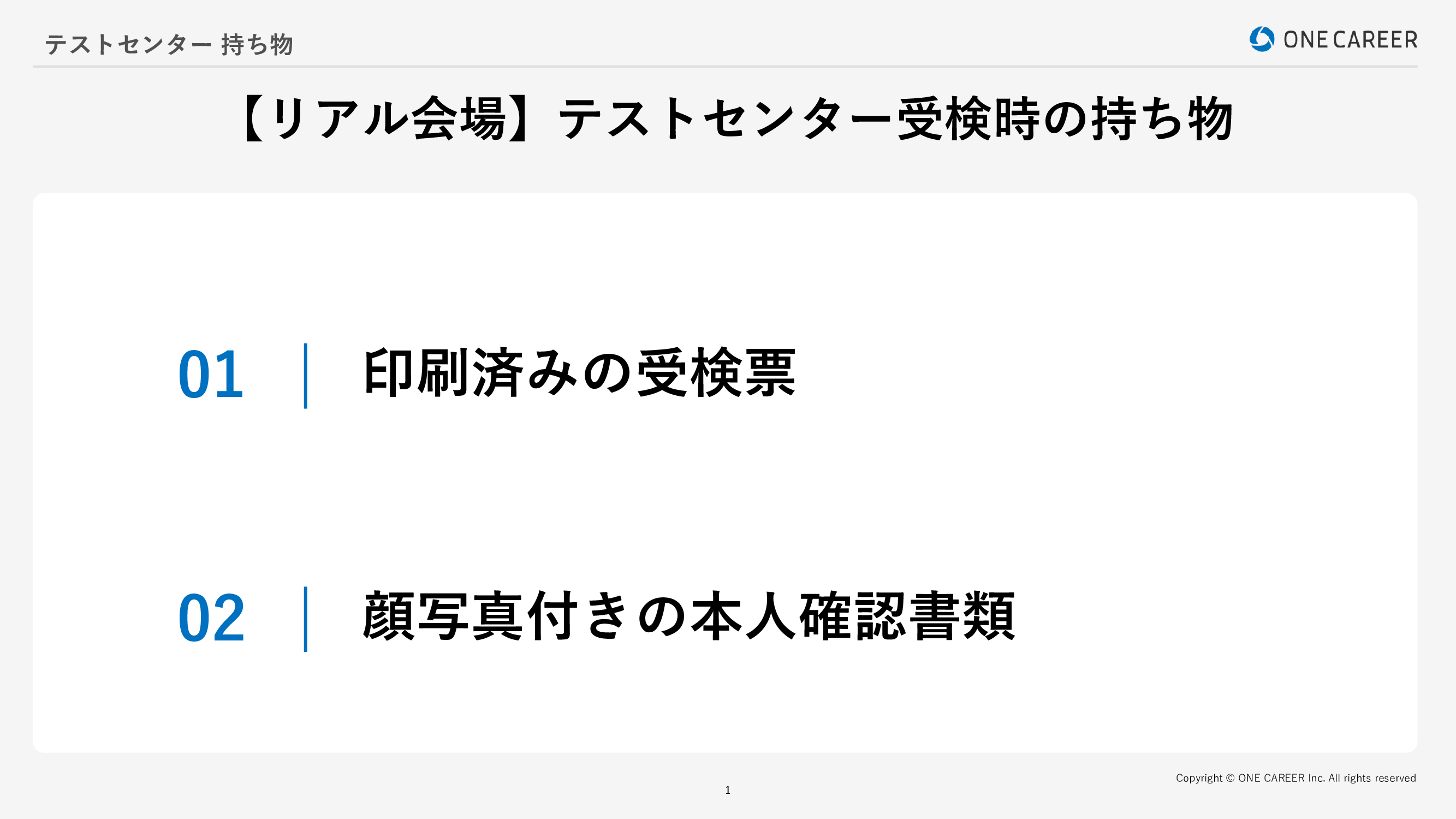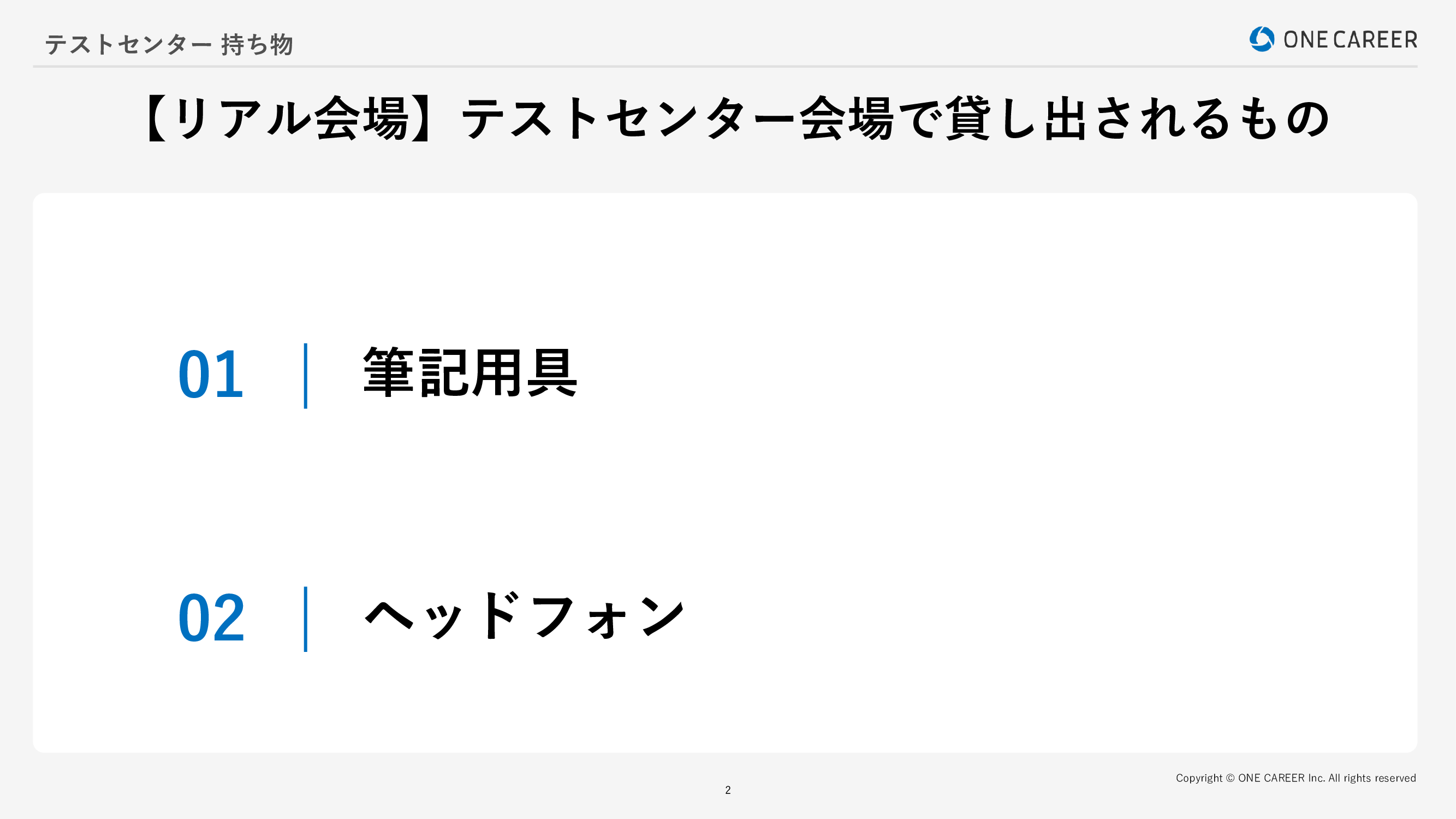 【リアル会場】テストセンター受検時の持ち物 ・印刷済みの受検票 ・顔写真付きの本人確認書類 【リアル会場】テストセンター会場で貸し出されるもの ・筆記用具 ・ヘッドフォン 【オンライン会場】テストセンター受検時の持ち物 ・顔写真付きの本人確認書類 ・筆記用具 ・メモ用紙 テストセンターで持ち込めないもの ・時計 ・電卓 ・スマホ