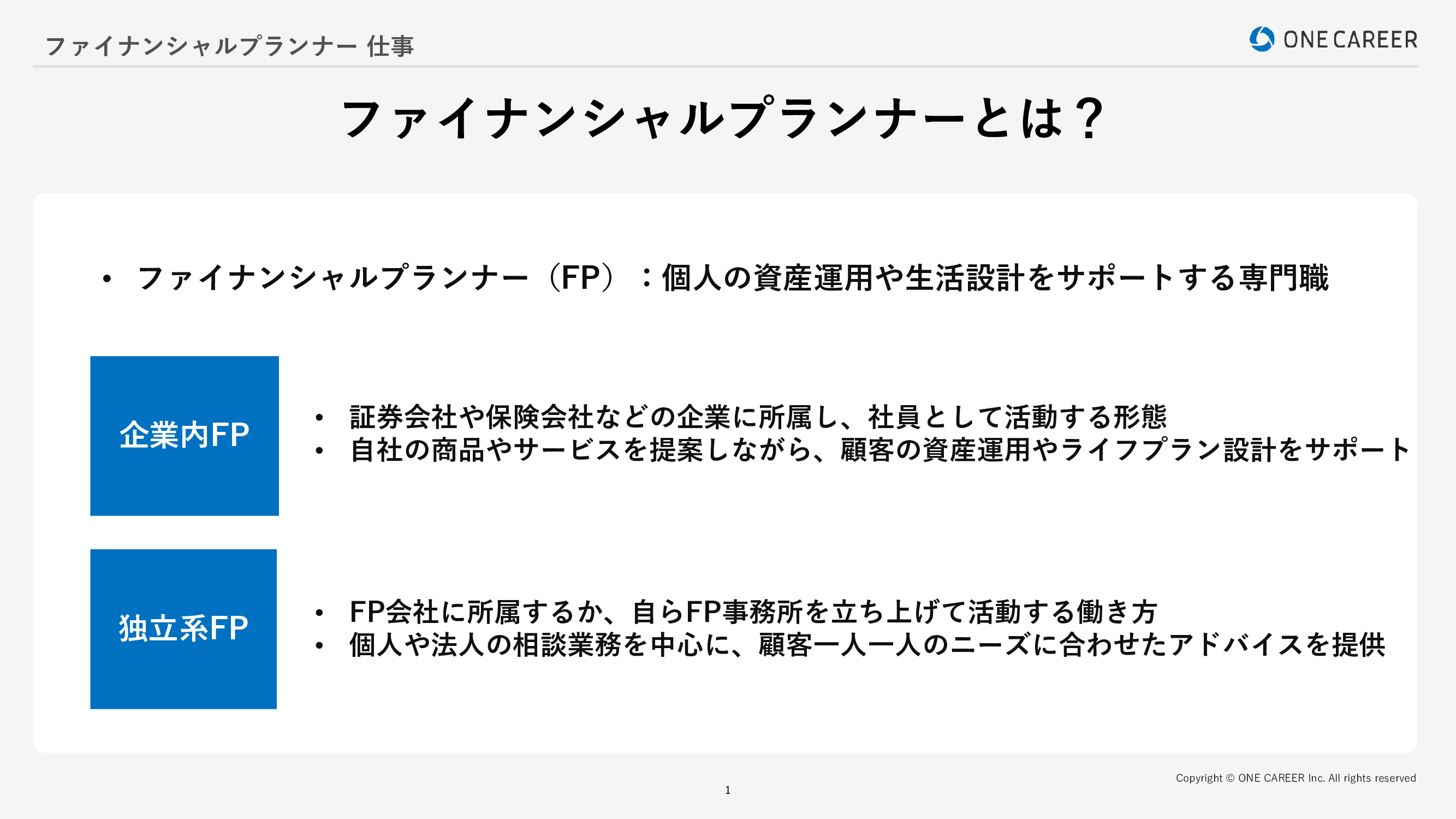 FPは、大きく分けて「企業内FP」と「独立系FP」の2つの働き方があります(※1)。