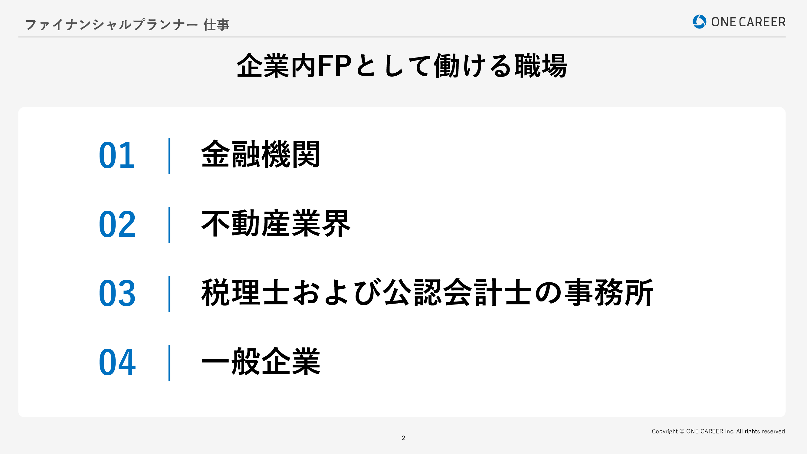 ここからは、企業内FPとして働ける具体的な働き先について詳しく見ていきましょう。