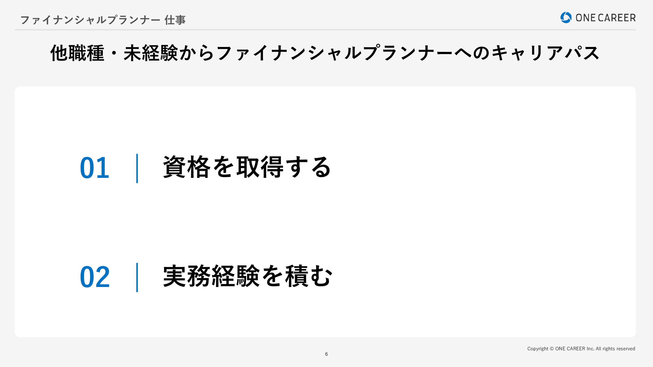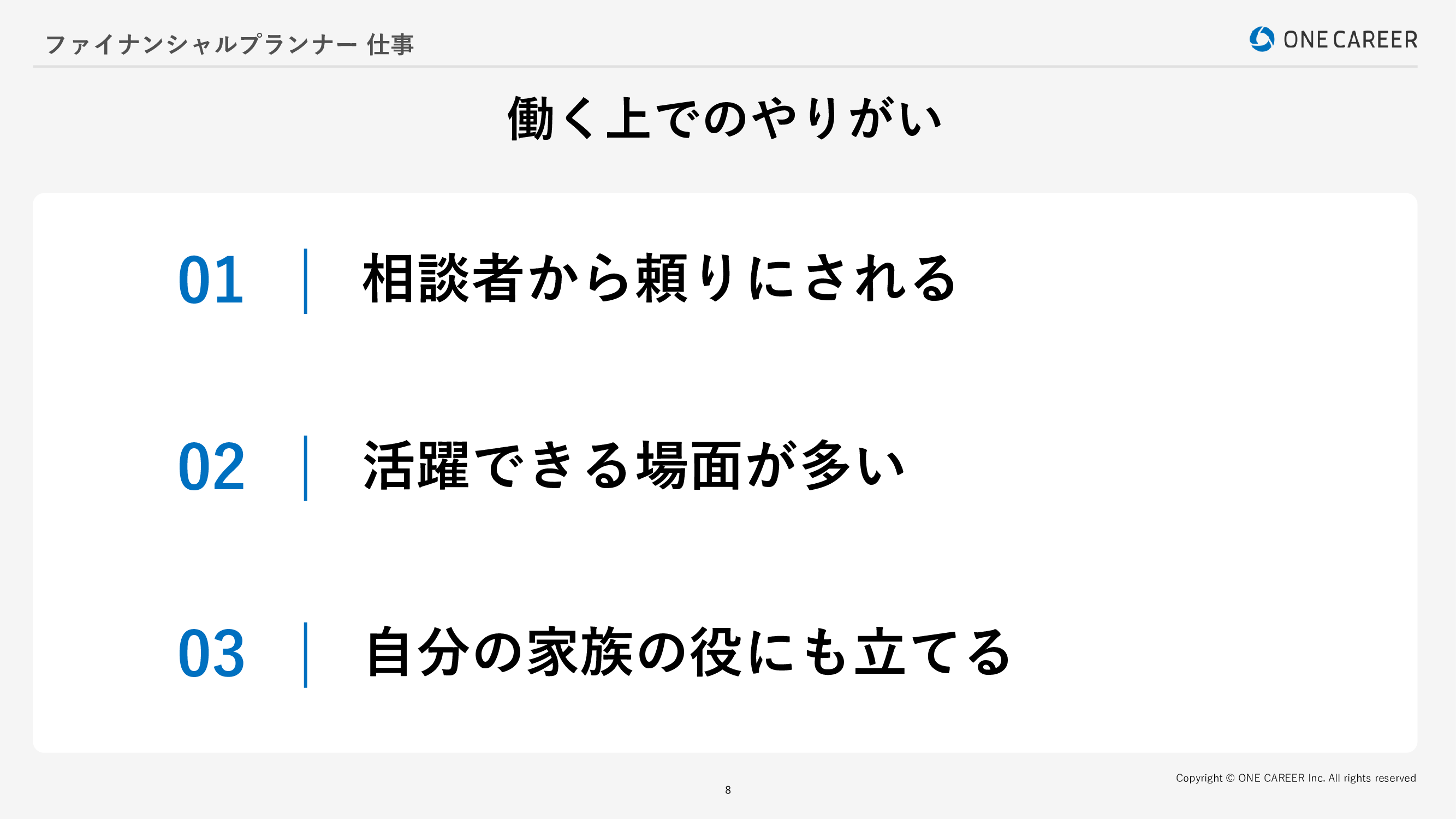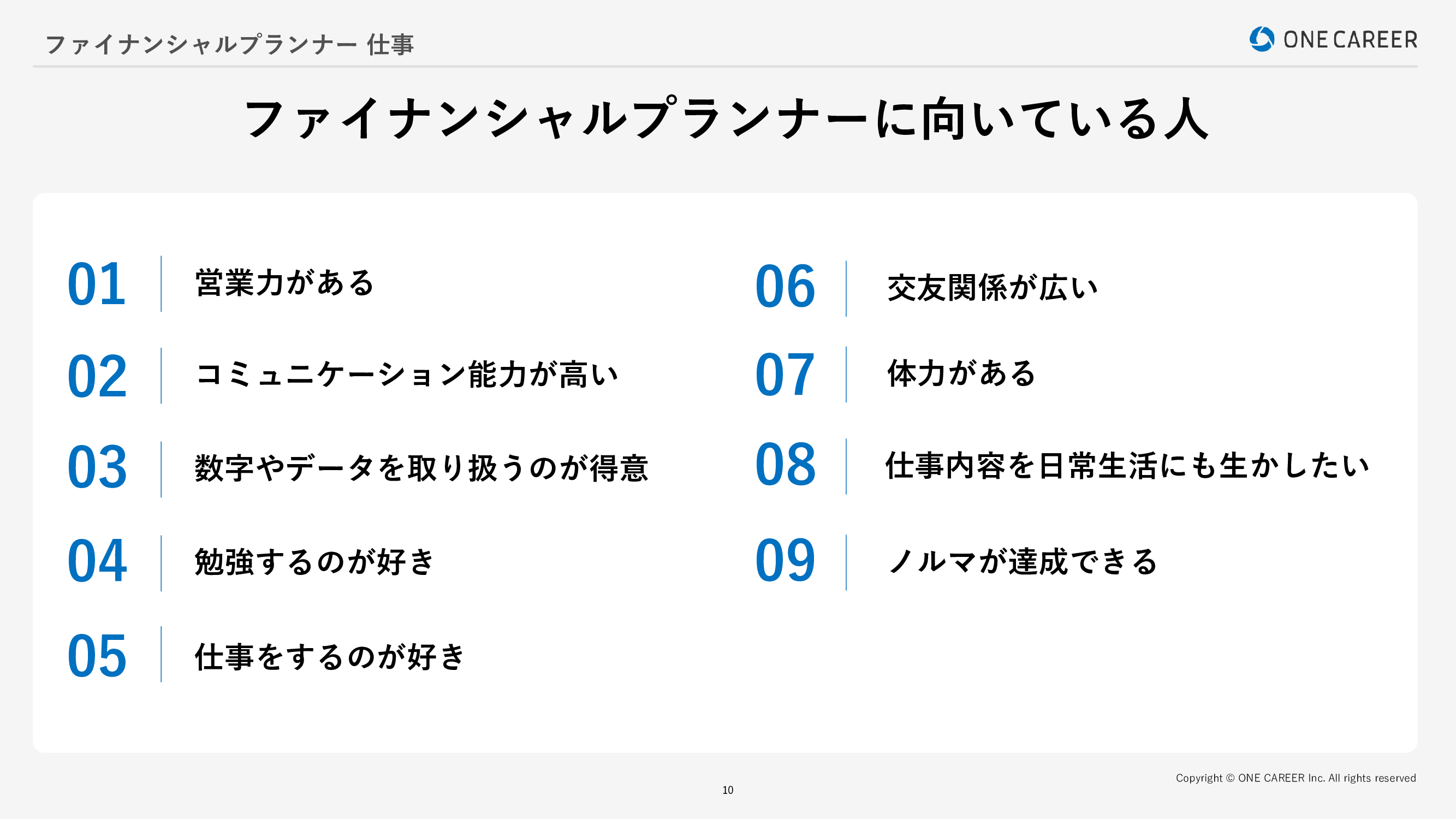 <目次> ●ファイナンシャルプランナーとは? 仕事内容と魅力 ・企業内FP|FPとして働ける職場 ・独立系FP ●ファイナンシャルプランナーは仕事がない・なくなるといわれる理由 ・FPに対する認知度が低い ・資格がなくてもできる仕事 ・独占できる仕事がない ・国家資格の中でも取得しやすい ・知識や経験がないとなかなか成果を出せない ●実はファイナンシャルプランナーの将来性が明るい理由 ・ライフプランに対する関心が高まっている ・資産運用の重要性が高まっている ・老後資金などお金の不安を抱えている人が増えている ●ファイナンシャルプランナーのキャリアパス・転職事例 ・ファイナンシャルプランナーの主なキャリアパス ・他職種・未経験からファイナンシャルプランナーへのキャリアパス ・ファイナンシャルプランナーから他職種へのキャリアパス ・他職種・未経験からファイナンシャルプランナーへの転職事例 ・ファイナンシャルプランナーから他職種への転職事例 ●ファイナンシャルプランナーのやりがい・働くメリット ・働く上でのやりがい ・ファイナンシャルプランナーになるメリット ・ファイナンシャルプランナーの年収・待遇 ●ファイナンシャルプランナーに向いている人 ・営業力がある ・コミュニケーション能力が高い ・数字やデータを取り扱うのが得意 ・勉強するのが好き ・仕事をするのが好き ・交友関係が広い ・体力がある ・仕事内容を日常生活にも生かしたい ・ノルマが達成できる ●ファイナンシャルプランナーの仕事がきついといわれる理由 ・金融商品を売り続けなくてはいけない ・営業のノルマがきつい ・顧客との信頼を築く必要がある ・最新の金融情報を収集する必要がある ・独立のハードルが高い ●有利に働く資格・経験 ・1級~3級FP技能士 ・AFP ・CFP ●ファイナンシャルプランナーの仕事の選考に向けた対策 ・エントリーシート(ES)対策 ・Webテスト対策 ・面接対策 ・OB・OG訪問 ●おわりに