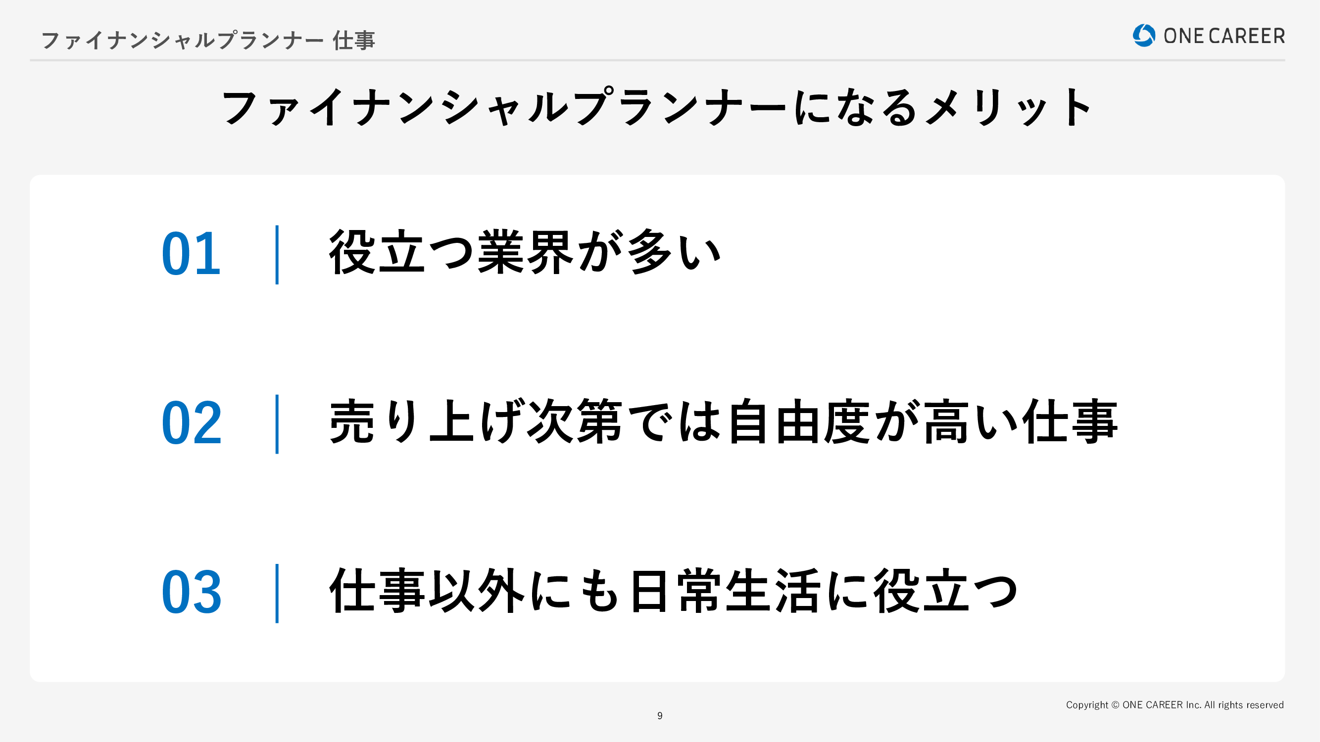 いかがでしたか。今回はFPの仕事についてご紹介しましたが、他にもさまざまな職種があります。自己紹介などを通じて自分に合った、自分がしたい仕事をぜひ探してみてください。
