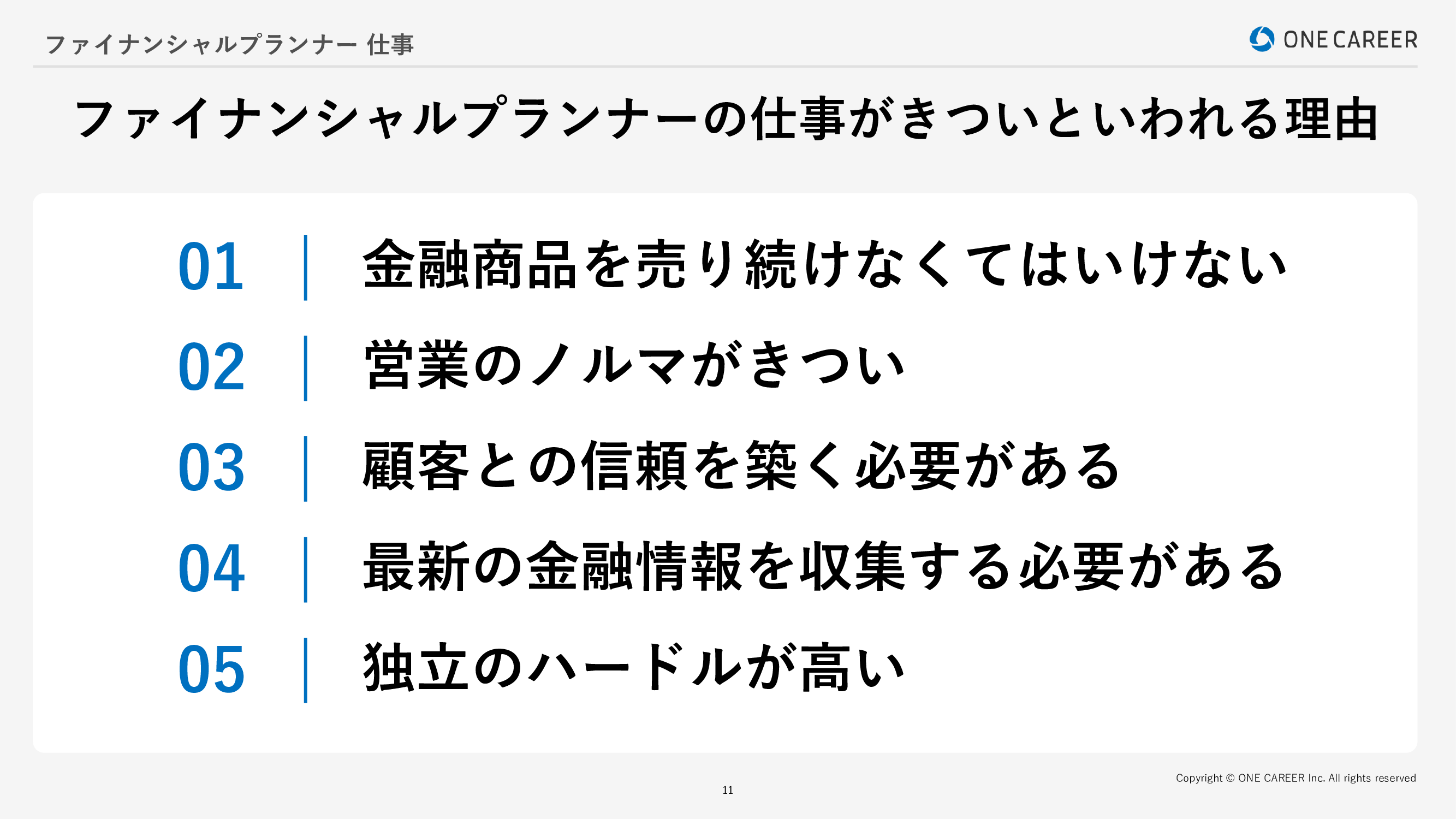 FPは、営業が仕事の中心であり、厳しい営業ノルマを達成し続ける必要があるため、きついと感じることがあります。