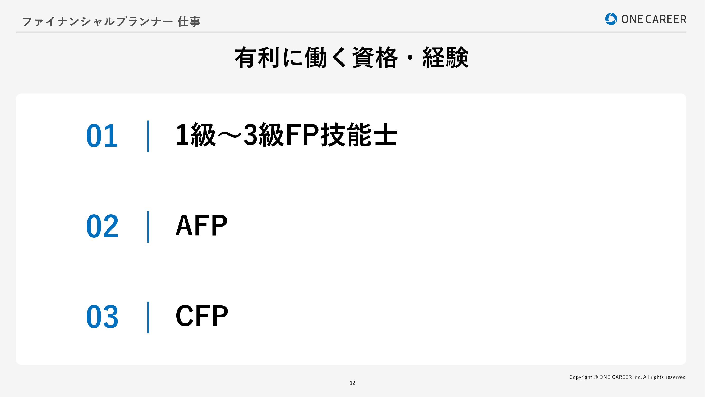 1級~3級FP技能士、AFP(アフィリエイテッドファイナンシャルプランナー)、CFP(サーティファイドファイナンシャルプランナー)などの資格を保有していることで、キャリア形成や信頼性の向上につながります。