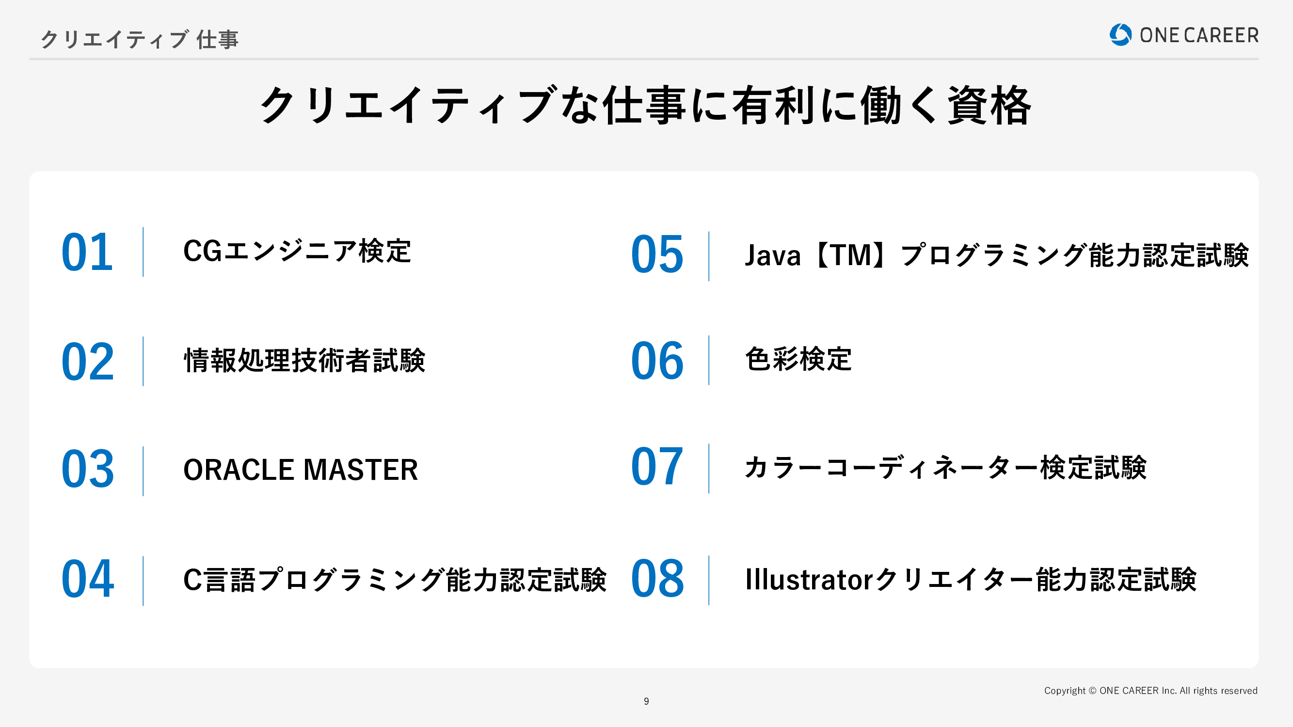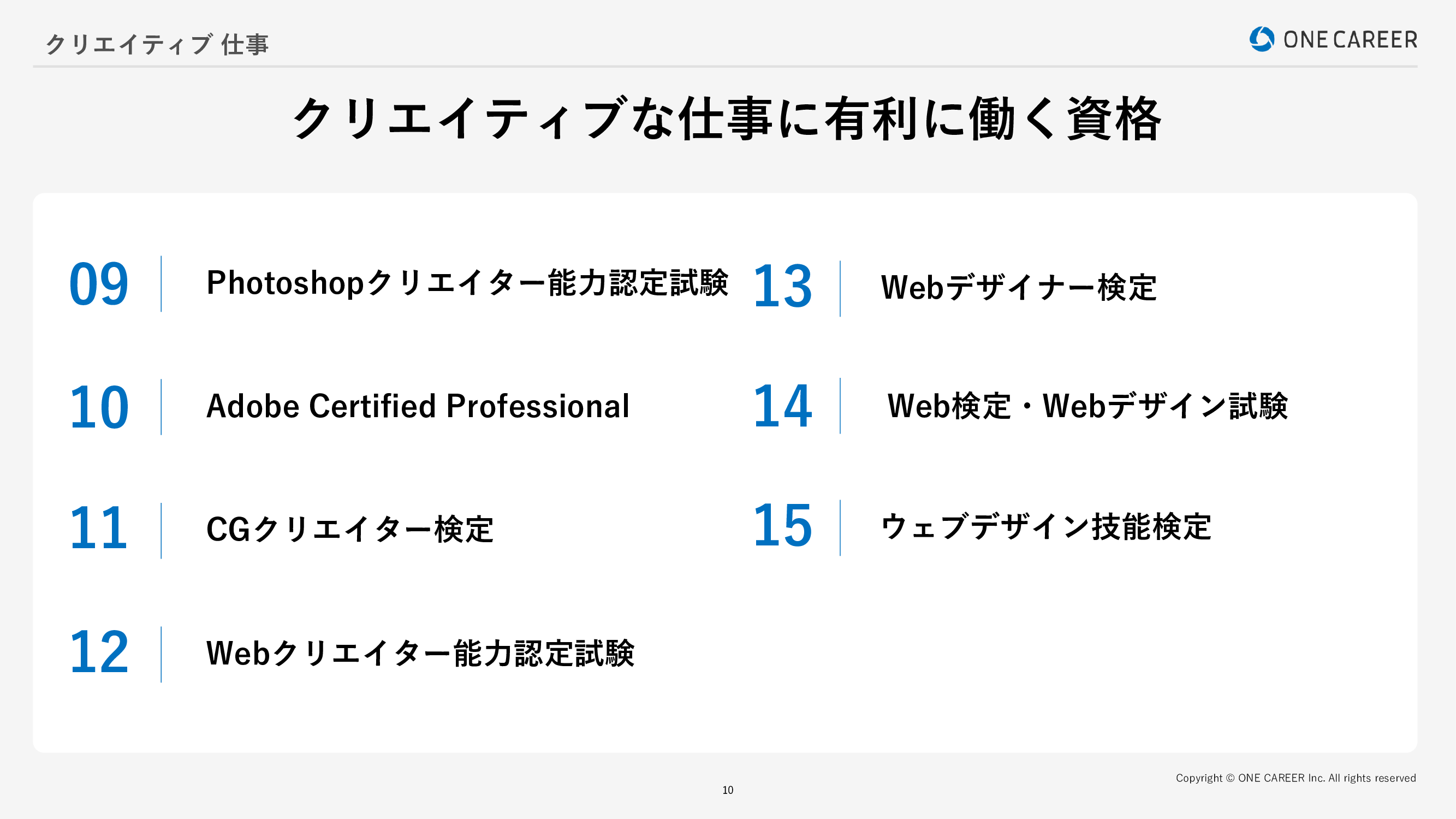 <目次> ●クリエイティブな仕事とは? クリエイティブな仕事内容と魅力 ・クリエイティブな仕事とは? ・クリエイティブな仕事一覧 ●クリエイティブな仕事の主なキャリアパス ・主なキャリアパス ・未経験・他職種からクリエイティブな仕事に就く方法 ・クリエイターが目指せる職種 ・他職種・未経験からクリエイティブ職へのキャリアパス・転職事例 ・クリエイティブ職から他職種へのキャリアパス・転職事例 ●クリエイティブな仕事のやりがい・年収・将来性 ・働く上でのやりがい ・クリエイティブな仕事の年収・待遇 ・クリエイティブな仕事の将来性 ●クリエイティブな仕事の大変なところ ・スキルやセンスがダイレクトに反映される ・納期に追われて長時間労働になることがある ・正解がない難しさがある ・スキルアップの勉強を続ける必要がある ●クリエイティブな仕事は未経験でも可能? 向いている人の特徴 ・もの作りが好きな人 ・トレンドをつかみ企画力がある人 ・知識や技術を貪欲に習得する人 ・コミュニケーション能力がある人 ●クリエイティブな仕事に向いていない人 ・長時間粘り強く業務を遂行することが苦手な人 ・仕事に大きな変化を求めない人 ●クリエイティブな仕事に有利に働く資格 ・CGエンジニア検定 ・情報処理技術者試験 ・ORACLE MASTER ・C言語プログラミング能力認定試験 ・Java【TM】プログラミング能力認定試験 ・色彩検定 ・カラーコーディネーター検定試験 ・Illustratorクリエイター能力認定試験 ・Photoshopクリエイター能力認定試験 ・Adobe Certified Professional(アドビ認定プロフェッショナル) ・CGクリエイター検定 ・Webクリエイター能力認定試験 ・Webデザイナー検定 ・Web検定・Webデザイン試験 ・ウェブデザイン技能検定 ●クリエイティブな仕事の選考対策 ・エントリーシート(ES)対策 ・Webテスト対策 ・面接対策 ・OB・OG訪問 ●おわりに