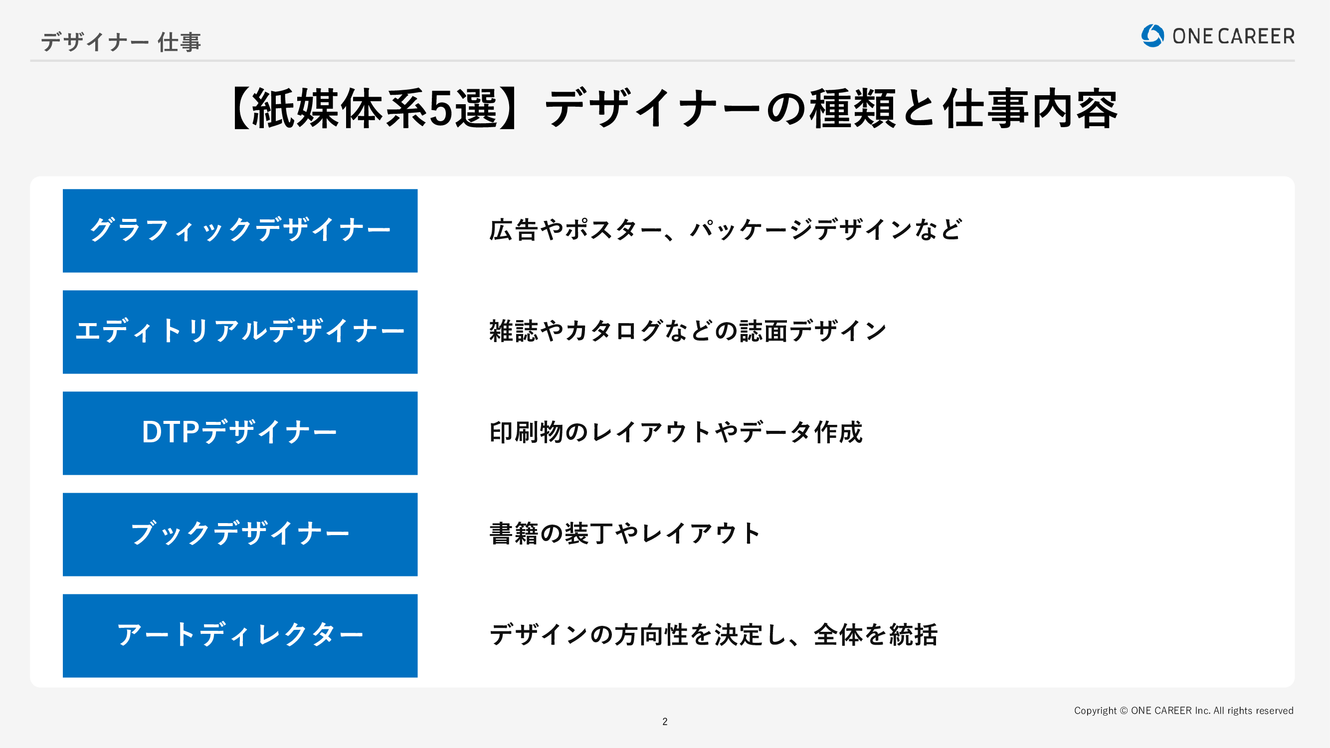 紙媒体のデザイナーには、以下の5つの職種があります。